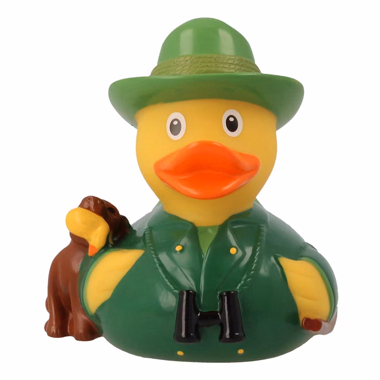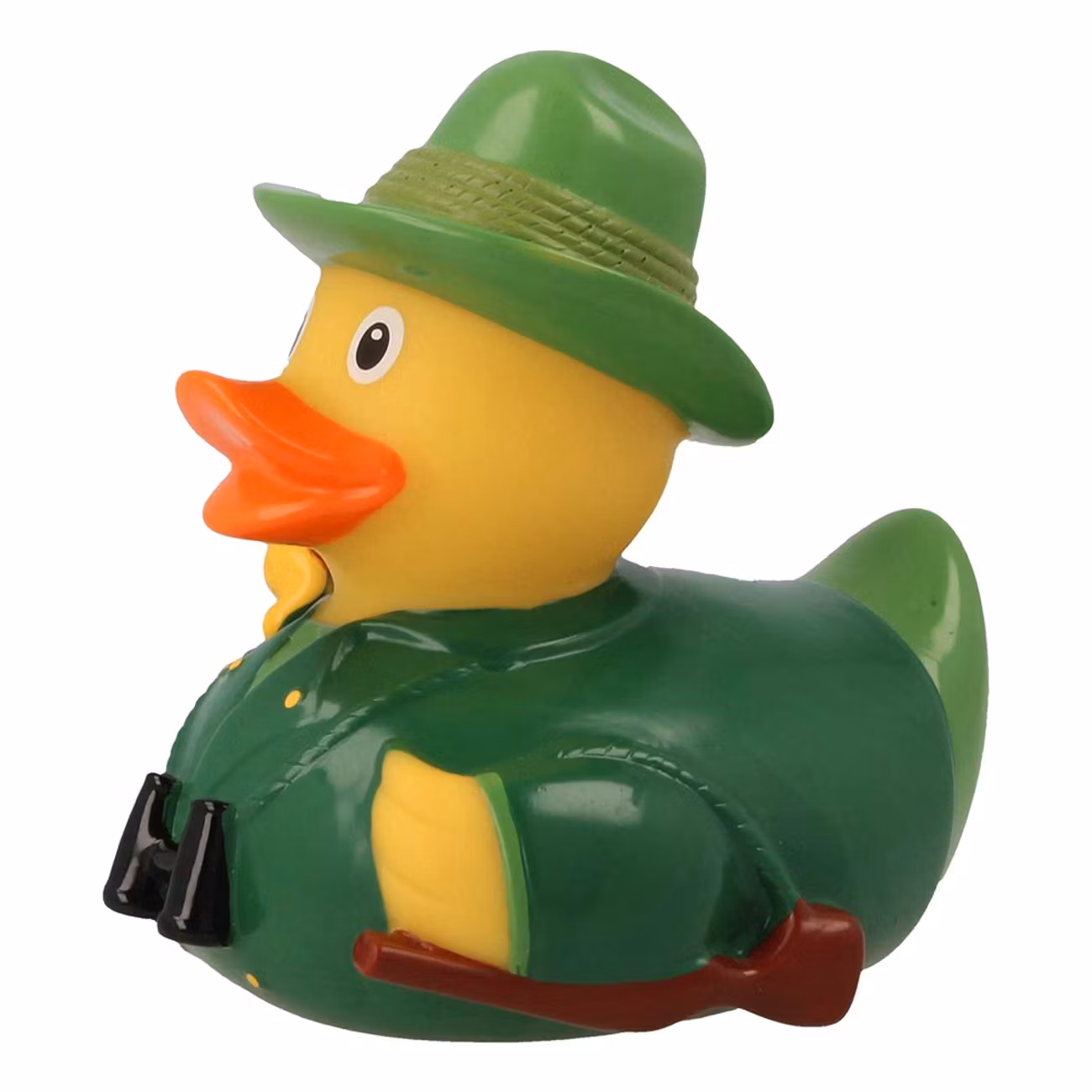 Badanka Jägare är en gul badbanka med en grön jaktkostym och en grön jägarhatt. På badankan finns också fina detaljer som en kikare, ett gevär och en jakthund. Badankan är 8,5 cm stor.