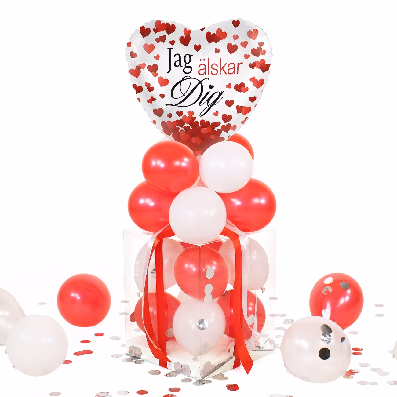 Ballongbox Jag Älskar Dig är ett kit med ballonger och tillbehör för att skapa en vacker & dekorativ ballongbukett. Kitet består av en transparent presentlåda, röda och vita latexballonger, samt en folieballong med texten "Jag älskar dig ". Dessutom kommer kitet med konfetti i silver och tylltyg i matchande färger. Instruktioner medföljer.
