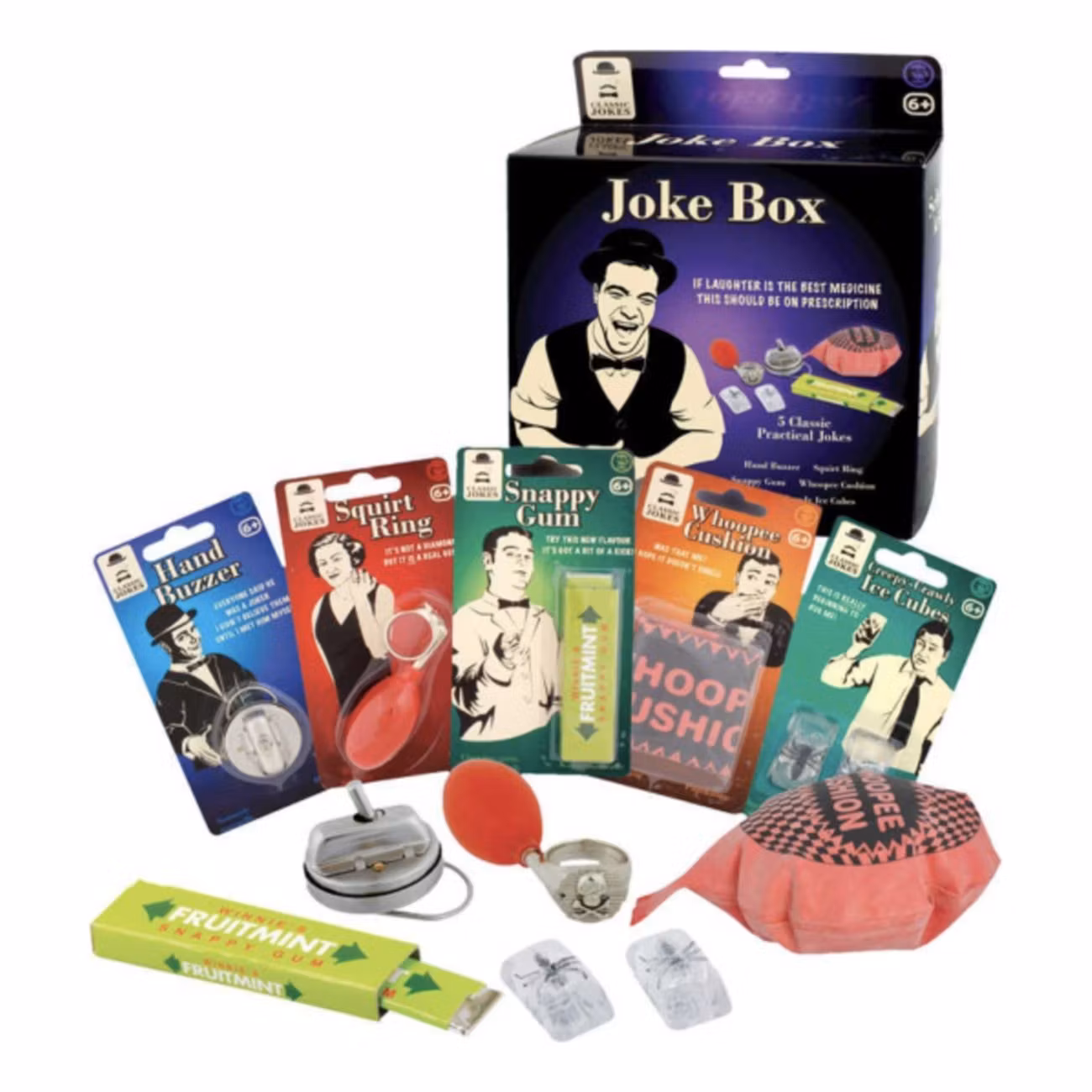 Barnens Klassiska Skämtlåda innehåller pruttkudde, hand buzzer, sprutande ring, snappy gum och isbitar med insekter.