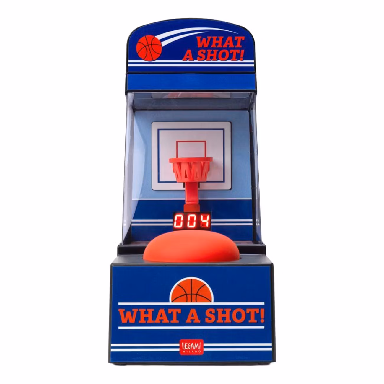 Basketspel Mini Arkadspel är ett kompakt basketspel i arkadstil där du trycker på kudden för att skjuta iväg bollen mot korgen. Spelet har tre tidsintervall på 45, 90 respektive 120 sekunder, så du kan variera hur hårt det ska satsas varje omgång. Det drivs med tre AA-batterier och passar lika bra för ensamträning som för intensiva utmaningar mot vänner!