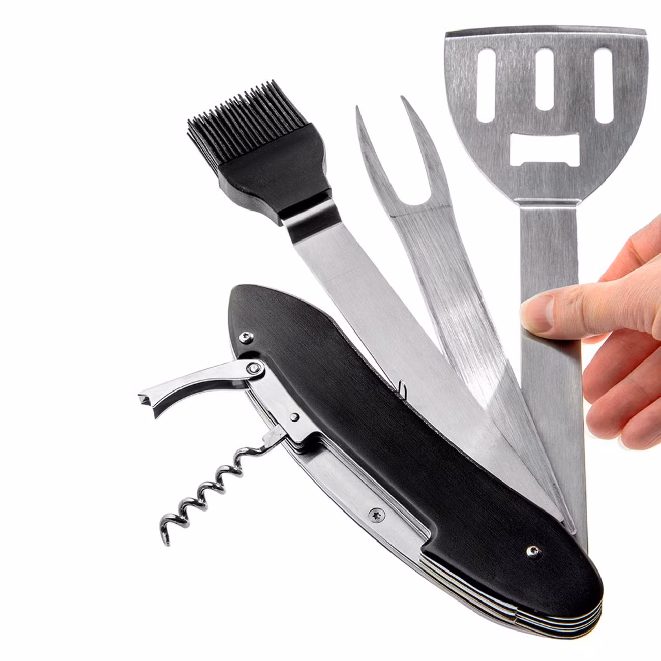 Med ett BBQ 5-i-1 Multiverktyg får du med en spatel, gaffel, marinadborste, korkskruv och kapsylöppnare. Med det tillhörande fodralet blir detta verktyg idealiskt för camping, picknick eller när du ska ta med den bärbara grillen till stranden.