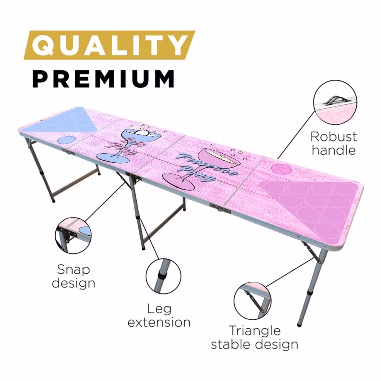 Beer Pong Bord Prosecco är ett stabilt spelbord helt tillverkat i aluminium med en vattenavvisande spelyta, där spill och slask enkelt torkas bort med varmt vatten och en trasa. Bordet mäter 240 cm långt och 60 cm brett, vilket motsvarar de officiella tävlingsmåtten som används i bland annat Världmästerskap i Beer Pong. Bordet är höj- och sänkbart och kan justeras utifrån egna önskemål (70/55 cm) samt kan enkelt transporteras och bäras då den är hopfällbar och utrustad med ett bärhandtag. I hopfällt läge mäter det endast 60 x 60 x 14 cm stort.
