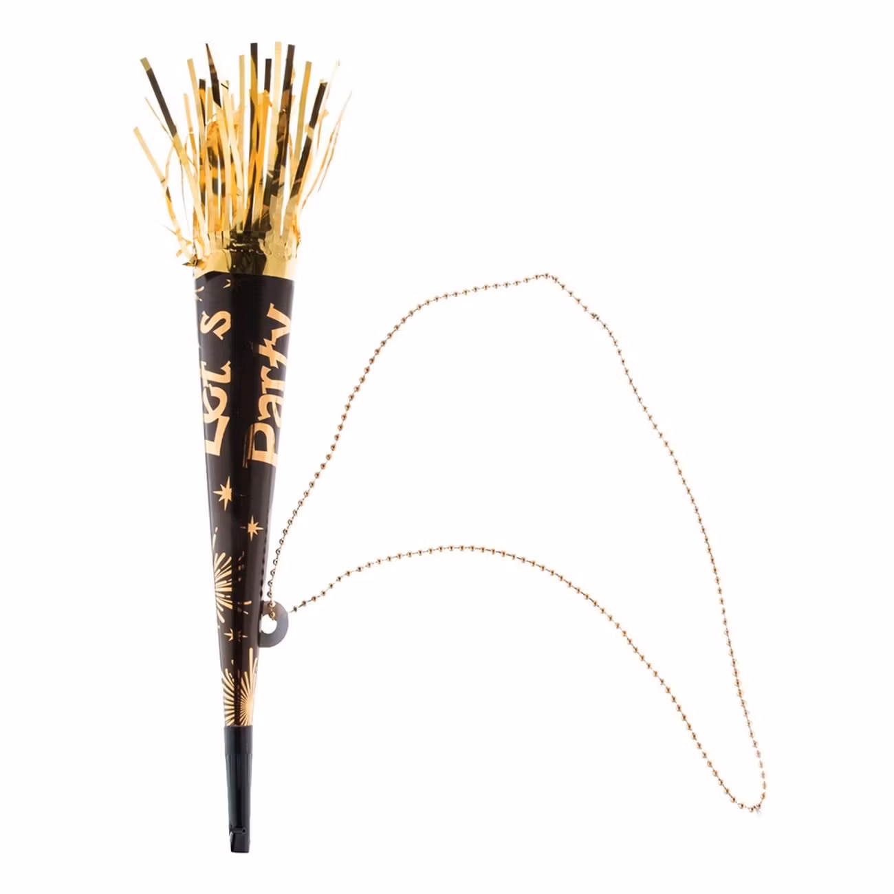 Ett blåshorn är en härlig stämningshöjare! Den här svarta partytutan med guldfärgade detaljer kan du hänga runt halsen som ett halsband. Så fort du känner att feststämningen måste höjas så blåser du i tutan. Dela gärna ut en tuta till alla dina gäster eller duka med dem runt festbordet!