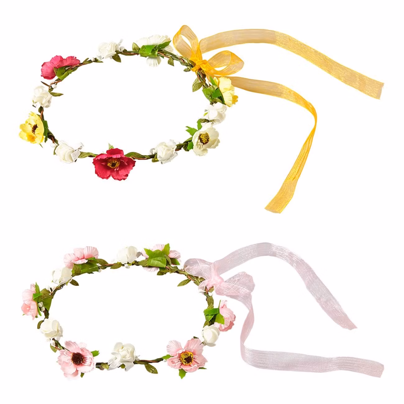 Blomsterkrans med Band är en söt huvudkrans tillverkad av textil och plast. Kransen är brun i grunden och finns i 2 olika utföranden. Antingen är kransen dekorerad med rosa och vita blommor och har en rosa rosett baktill eller så har den cerise, gula och vita blommor samt en gul rosett. Kransarna är osorterade så det blir en överraskning vilken du får vid beställning.