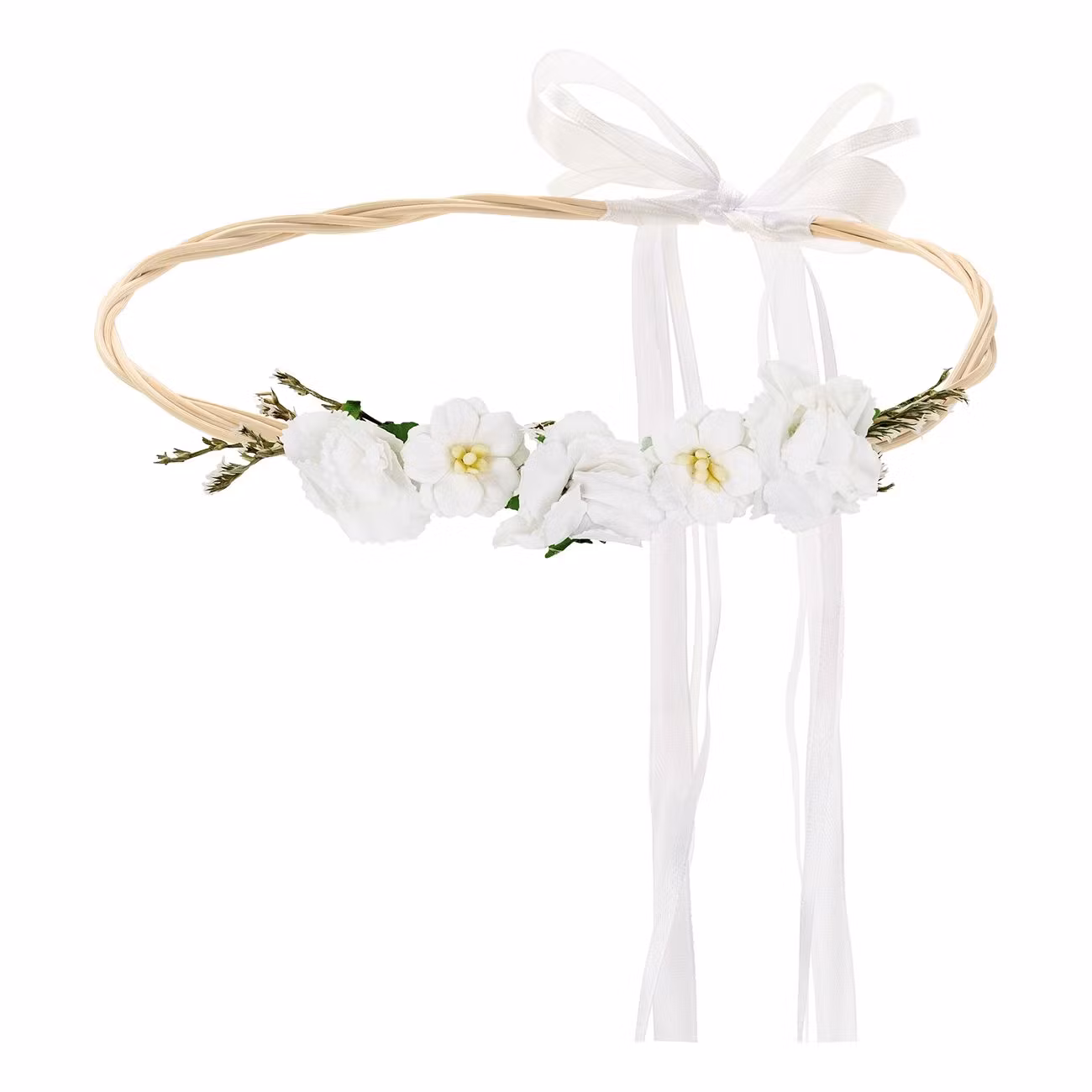 Blomsterkrans Vit med Rosett är en krans av vita konstgjorda blommor och en knuten rosett baktill att använda på somriga evenemang eller maskeraden. Kransen kommer i en storlek som primärt passar vuxna.