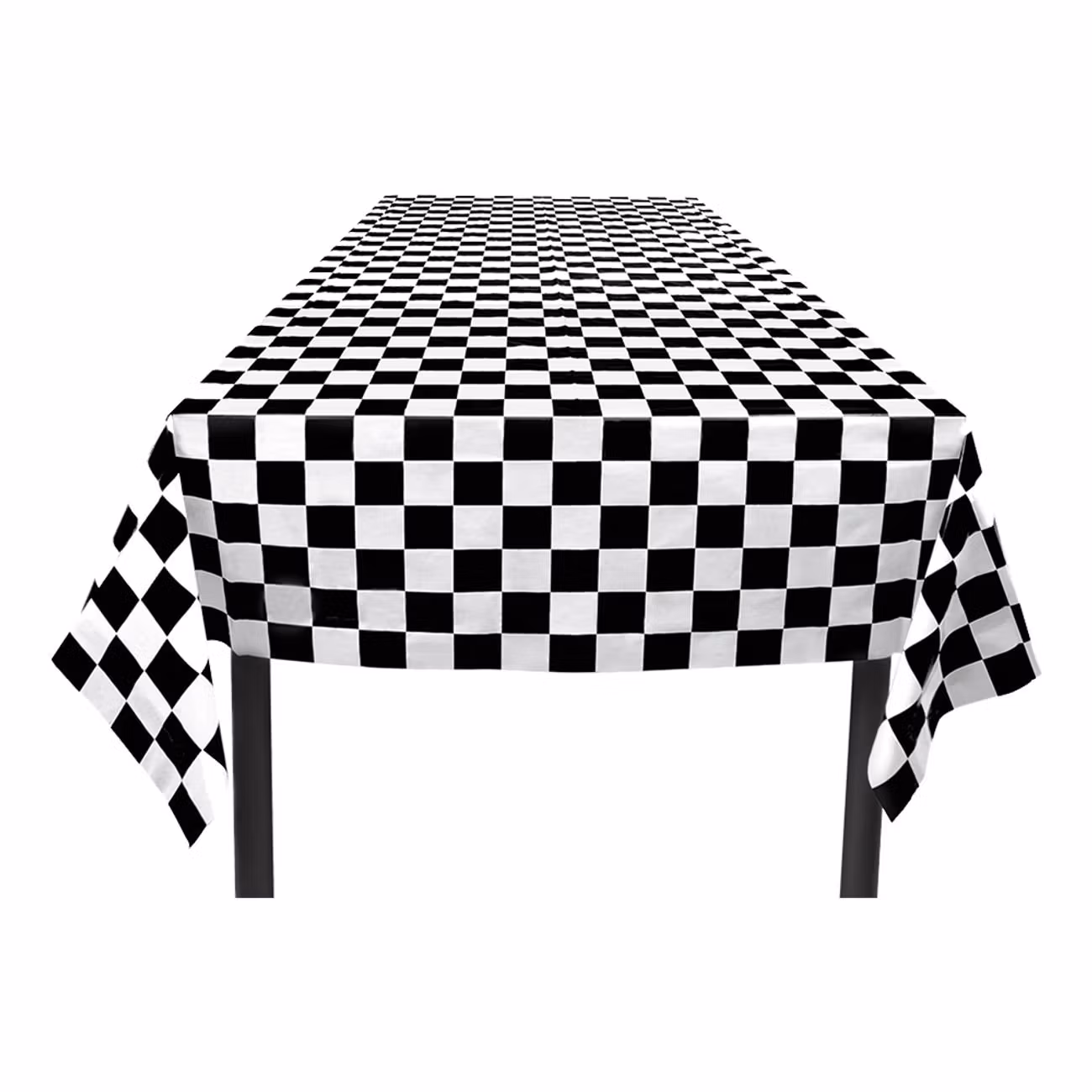 Bordsduk Schackrutig är en svartvit, rutig bordsduk. Den passar utmärkt på barnkalaset där barnen kladdar mycket med maten, på den stilrena festen eller på födelsedagsfesten för den som älskar racertävlingar och endast ser en Formel 1-flagga när personen ser duken. Mäter 130 x 180 cm.