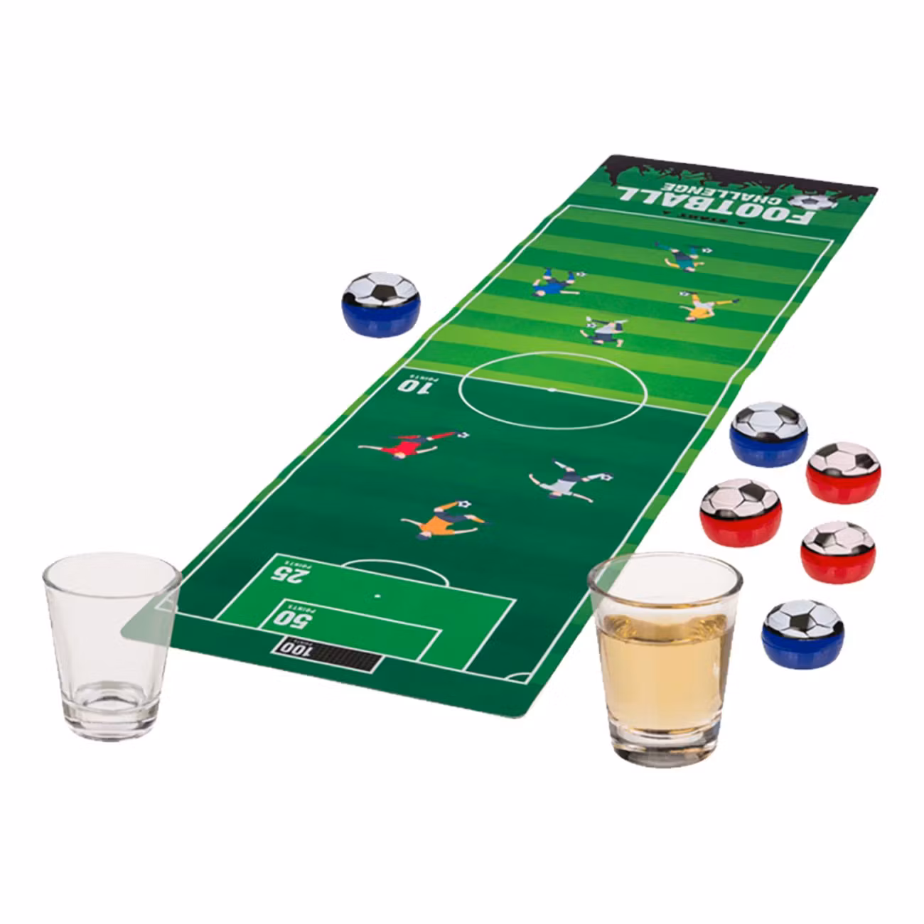 - Inkl. 1 x Spelplan, 6 x fotbollar, 2 x Shotglas