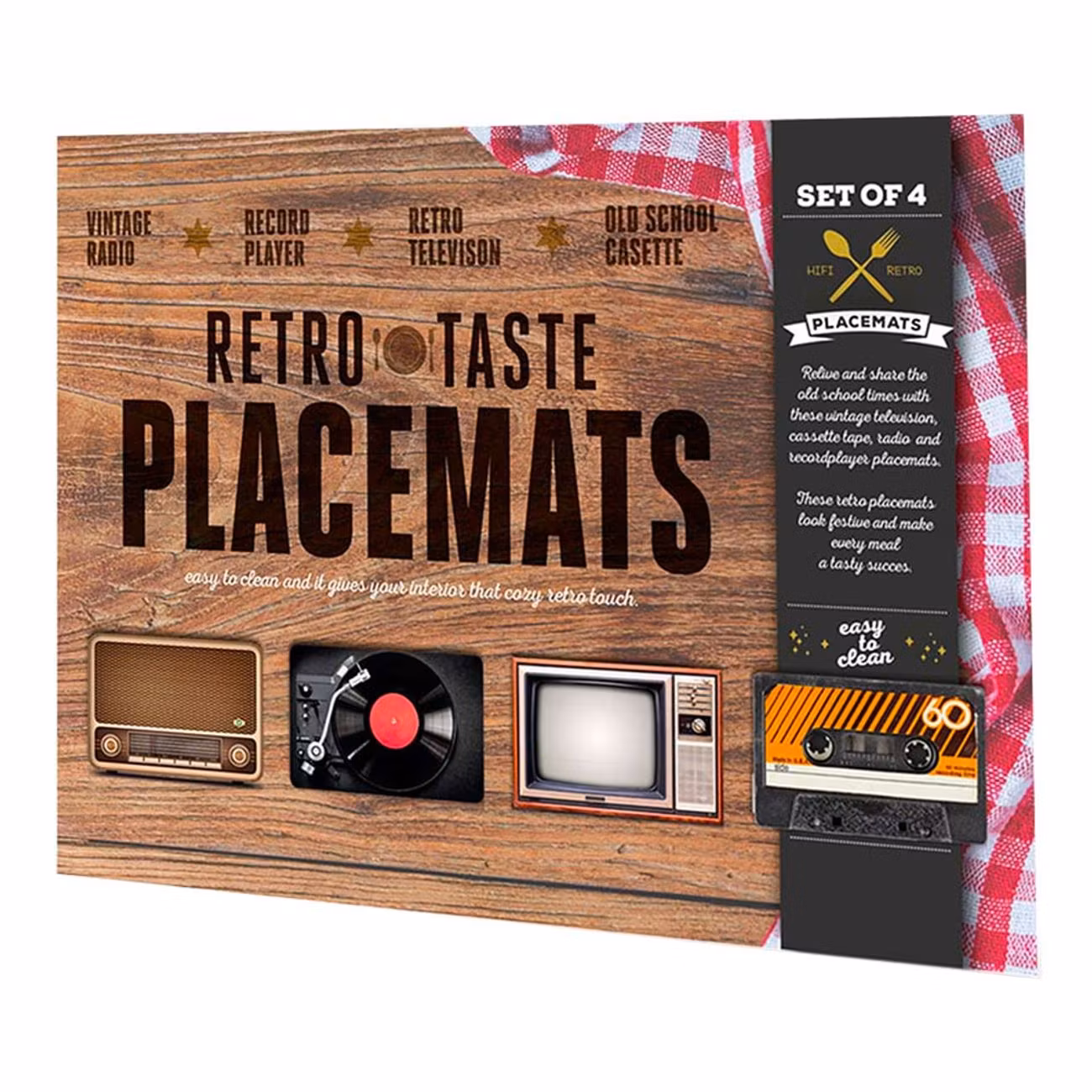 Bordstabletter Retro består av fyra stycken underlägg med olika motiv; en skivspelare, en gammal radio, en gammal tv och ett kassettband. Så låt middagen bli en nostalgitripp utan dess like!