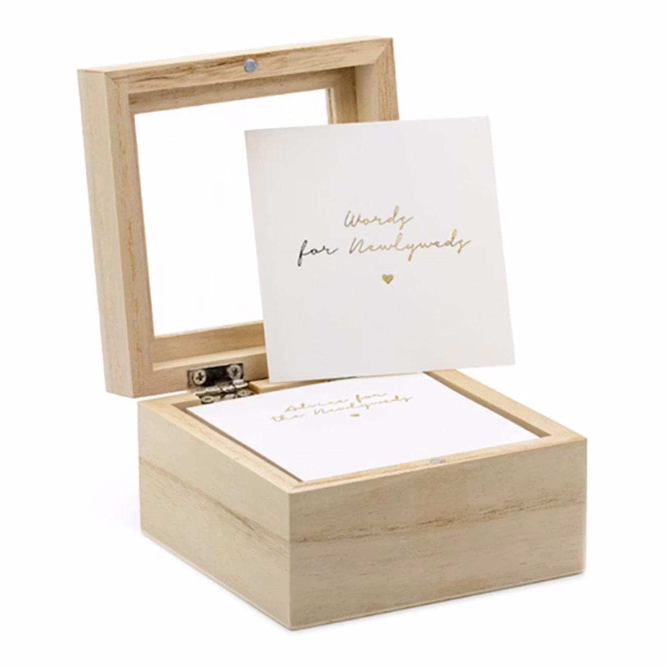 Box För Bröllopsråd innefattar en trälåda stängd av ett magnetlock i glas. Boxen mäter ca 9,5 x 9,5 x 6 cm och innehåller 100 st vita kort med en text i guldskrift ''words for newlyweds'' (ord till nygifta) att fylla i runtom. Texten på kortet är på engelska.
