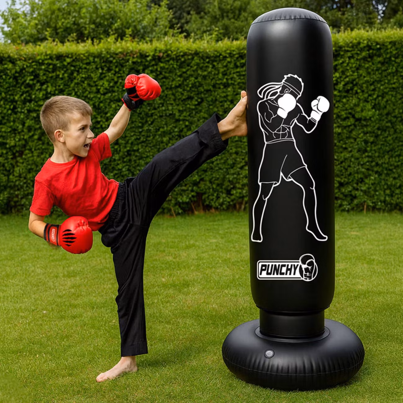 Boxningsset för Barn inkluderar ett par boxningshandskar och uppblåsbar boxningssäck som installeras på nolltid med den medföljande pumpen, och tack vare den viktade basen studsar den automatiskt tillbaka efter varje slag. Fyll basen med vatten eller sand för extra stabilitet, och låt leken börja – inomhus eller ute i trädgården!