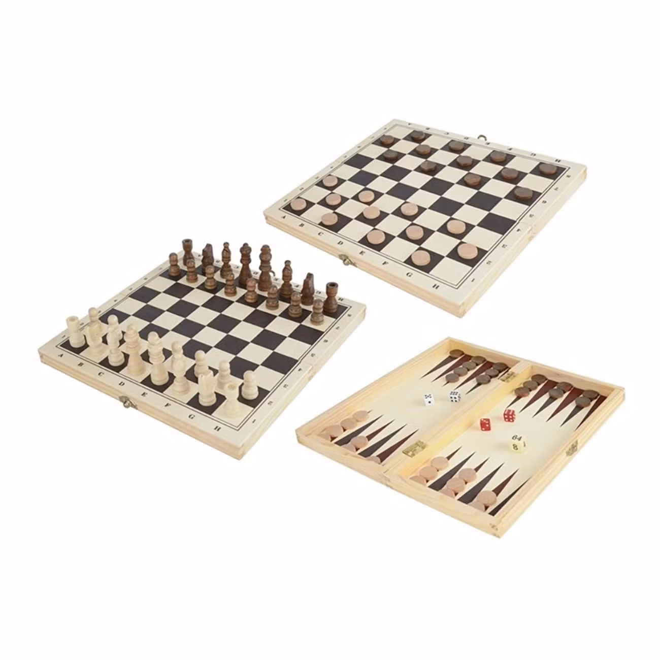Brädspel 3-i-1 är ett lyxigt multispelspet i trä som inkluderar allt du behöver för att spela schack, damspel och backgammon. Brädet är tillverkat av trä, mäter 29 × 29 cm centimeter (utvikt) och har ett schackbräde på utsidan, och ett fint backgammon-bräde på insidan.