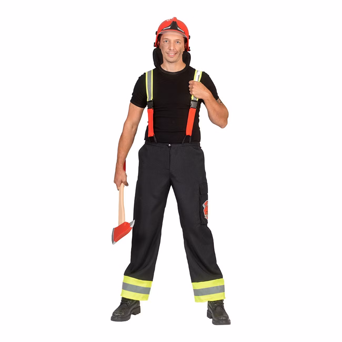 Brandmansbyxor är tillverkade i polyester och kommer i fyra olika storlekar för vuxna. Byxorna kommer med ett par neongröna hängslen med röda och gråa detaljer. Kombinera gärna med passande jacka, hjälm och brandsläckare etc för komplett brandmansutklädnad!
