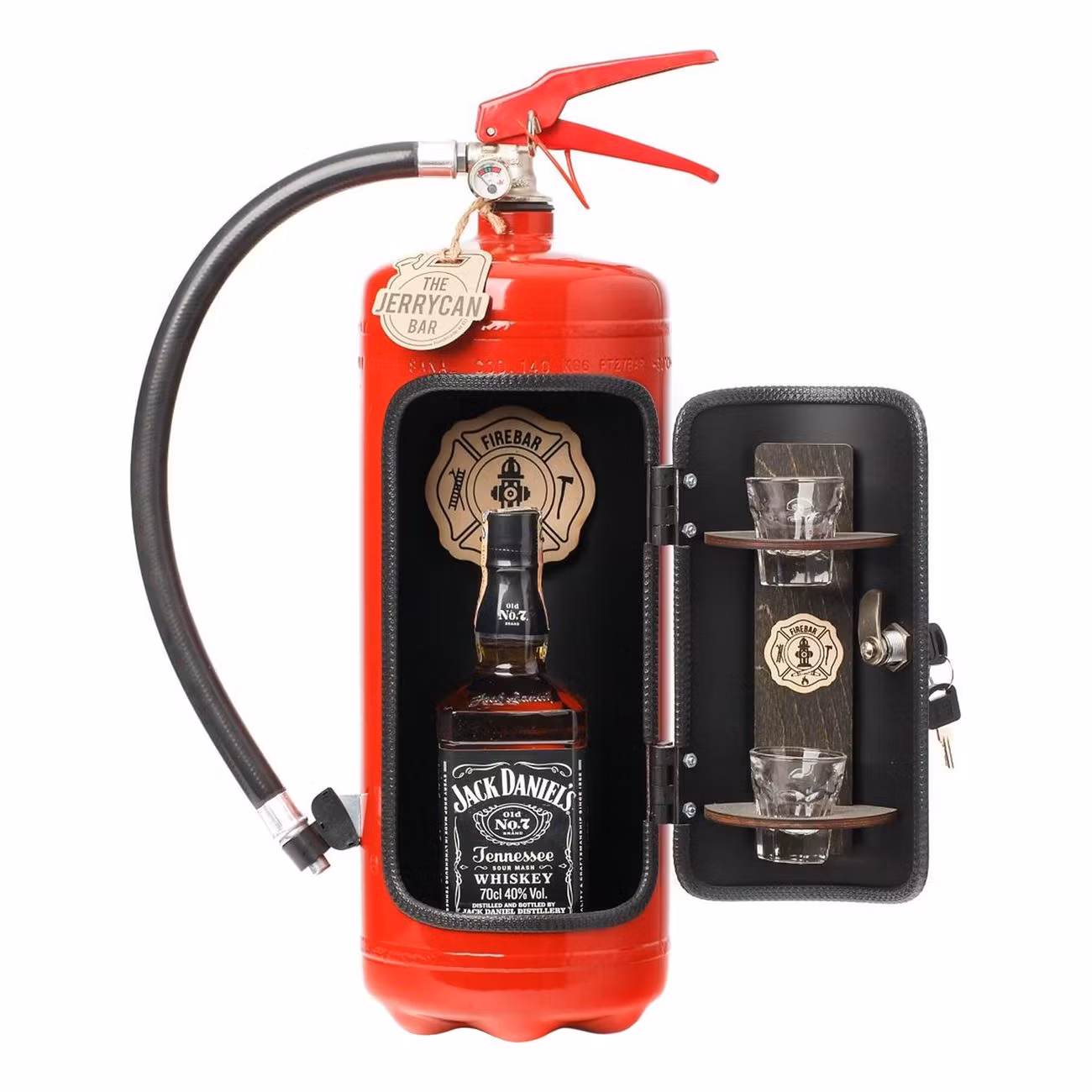 - Innehåll: Röd brandsläckare innehåller 2 glas, samt nyckel och lås. Rymmer en flaska Jack Daniels 1 liter (medföljer ej).