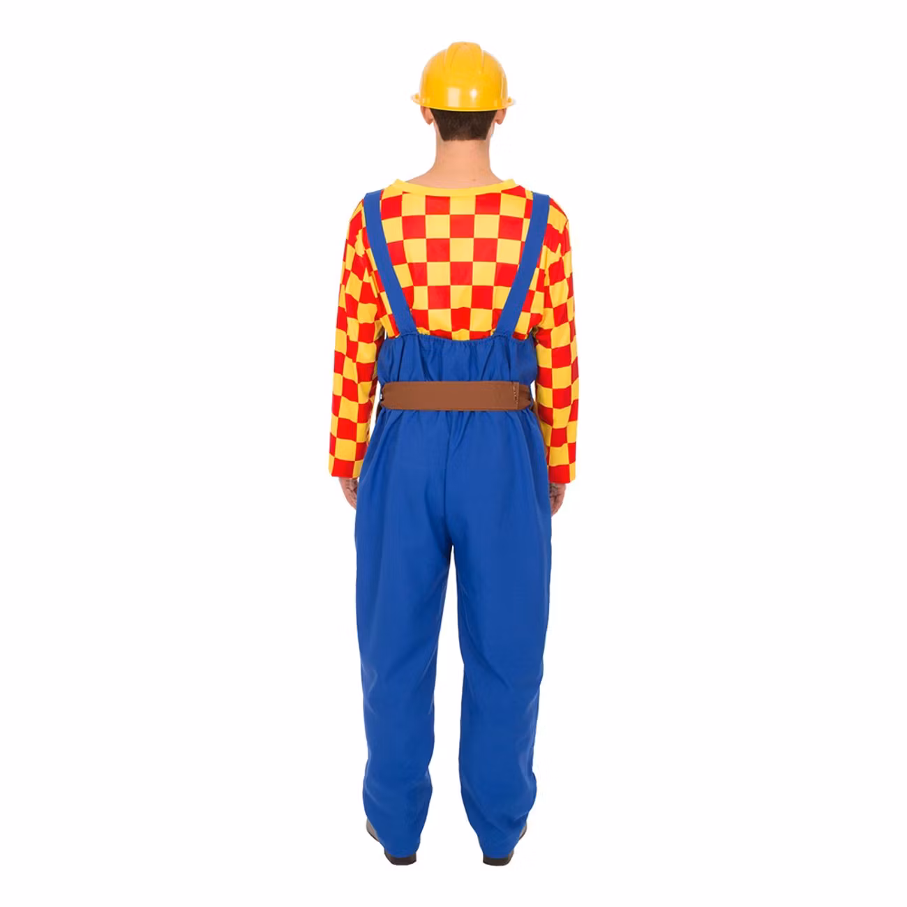 Byggare Bob Maskeraddräkt inkluderar en jumpsuit med blå hängselbyxor och fastsydd röd- och gulrutig tröja. Dräkten har även ett brunt snickarbälte med diversa verktyg av plast samt en gul hjälm.