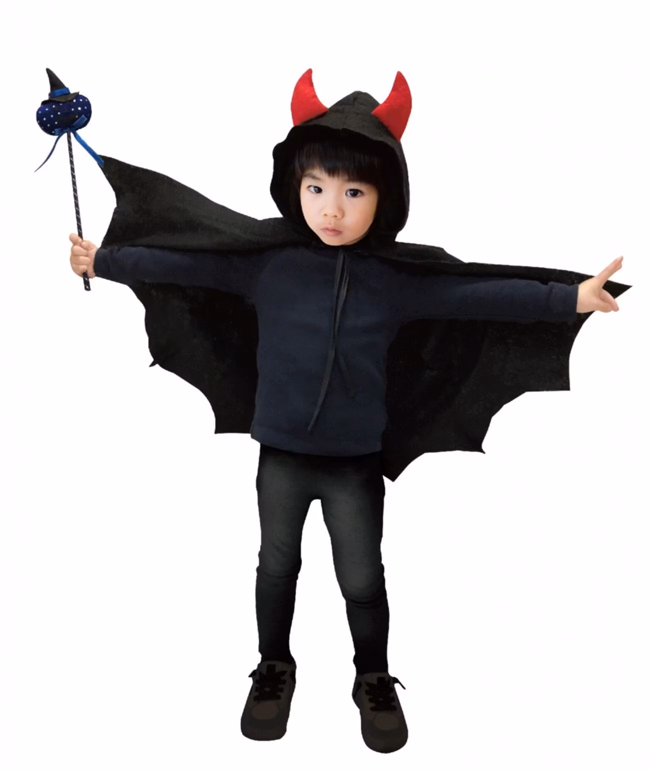 Cape i form av en fladdermus och matchande huva med röda djävulshorn.
