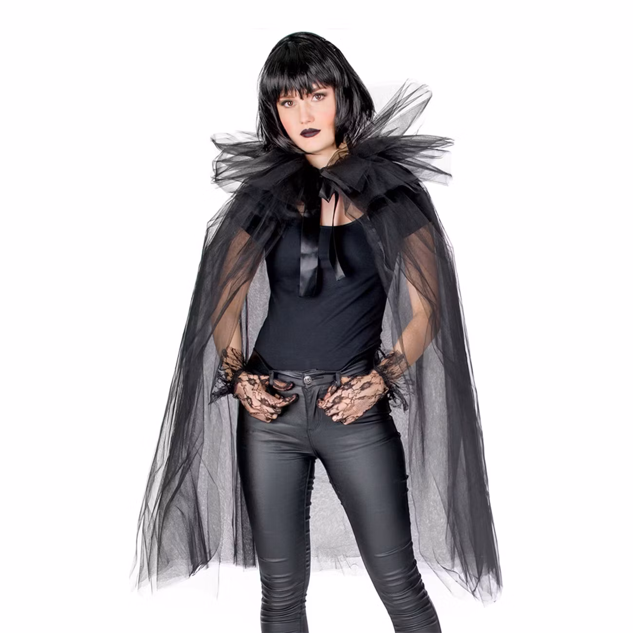 Cape Tyll Svart är tillverkad av flera lager transparent svart tyll som faller i ett mjukt och svepande draperi längs hela kroppen. Den har en voluminös krage med stor rosett framtill, vilket ger ett elegant men mystiskt uttryck. Perfekt till häxdräkter, gotiska temafester eller Halloween – där du vill ha en look som är både mörk, stilfull och teatralisk.