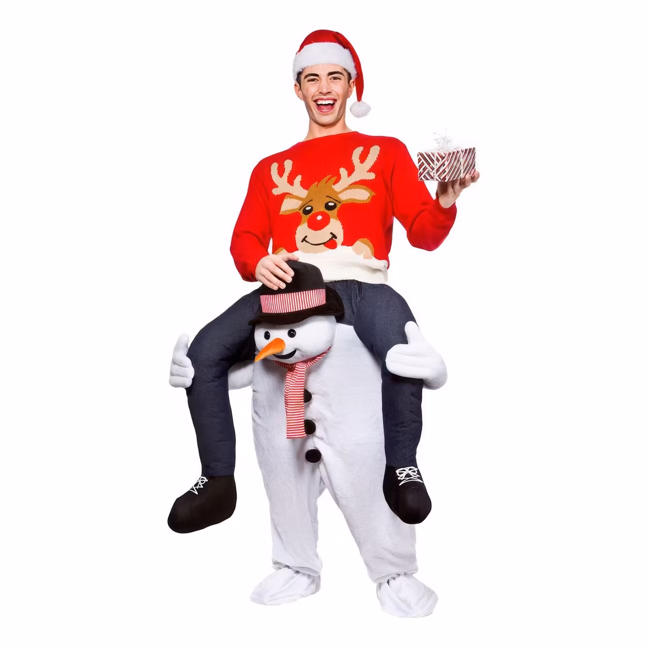 Carry Me Snögubbe Maskeraddräkt är en halvdräkt, eller byxdräkt, som föreställer en snögubbe som bär en person på axlarna. Dräkten inkluderar en vit snögubbe med morotsnäsa, svarta knappar, röd/vit-randig halsduk och svart hatt med band som matchar halsduken. Ett par stoppade ben är fastsydda över snögubbens axlar. Dräkten är fullständig så snart du tar på dig den, då ser det ut som om de stoppade benen är dina och dina egna ben är alltså i själva verket i snögubbens ben.