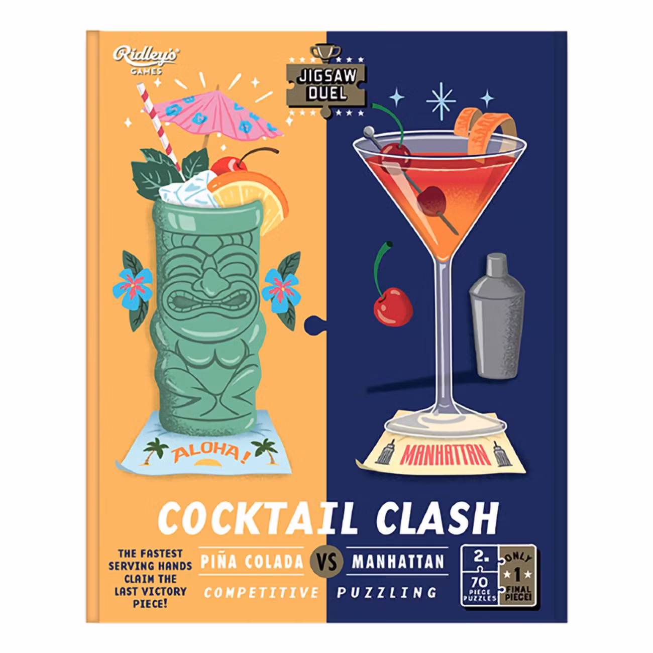 Cocktail Clash Pussel-Duell Spel inkluderar två stycken 70-bitars pussel: en föreställande pina colada och en föreställande manhattan. Spelet går således ut på att först få ihop sitt pussel; det finns bara en pusselbit som passar båda pussel. Medföljer gör även en trästativ som håller upp det färdiga pusslet.