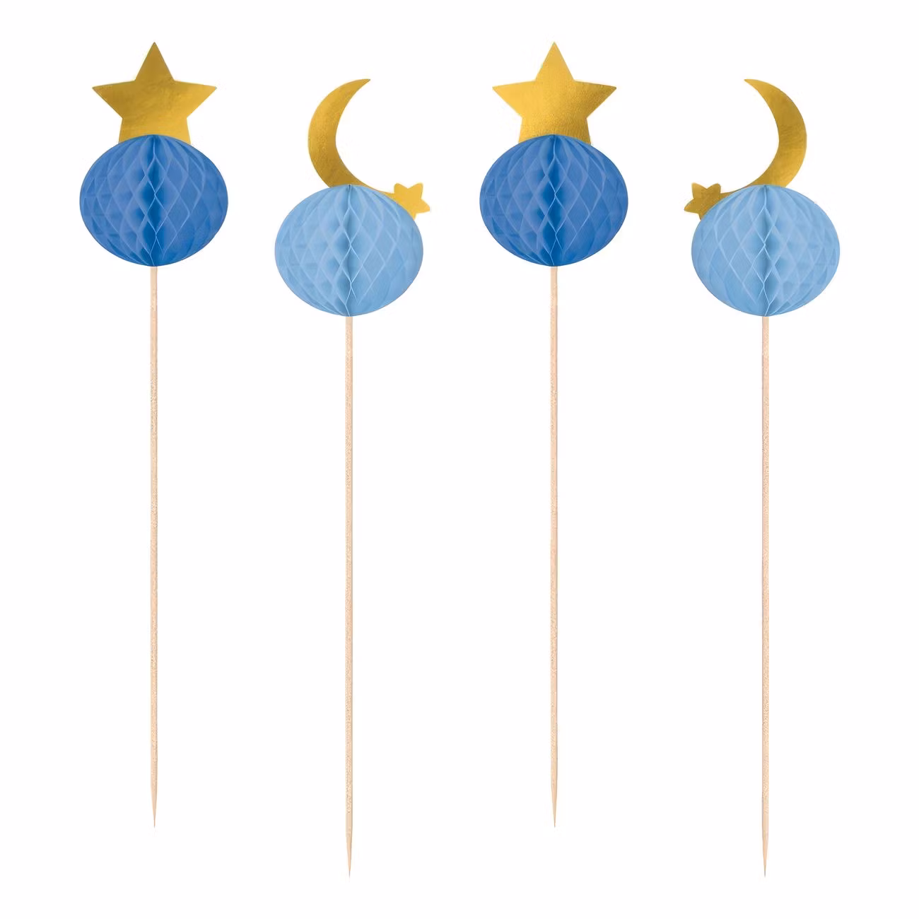 Cocktailpinnar Eid Mubarak inkluderar totalt tio stycken cocktailpinnar som kommer dekorerade med blå honeycombs, guldstjärnor och halvmånar.