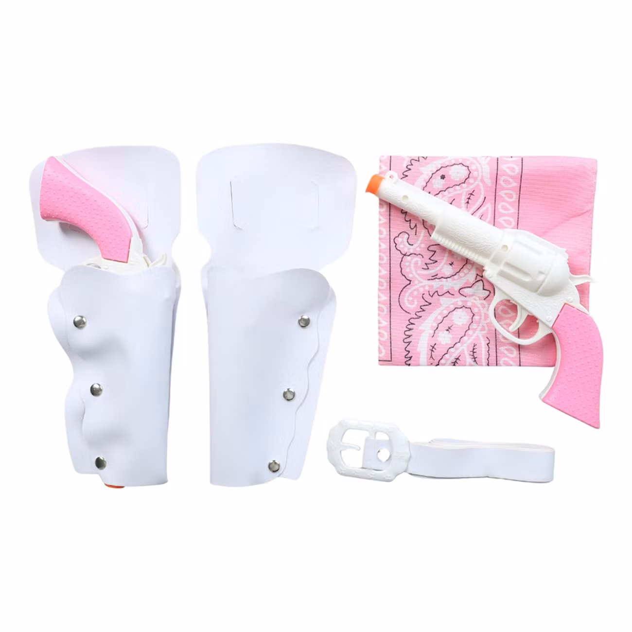 Pew-pew! Stick ut ur mängden på saloonen och utrusta dig med detta rosa cowboykit! Här får du både en fancy rosa scarf och två pistoler i händiga hölster inför en eventuell duell.