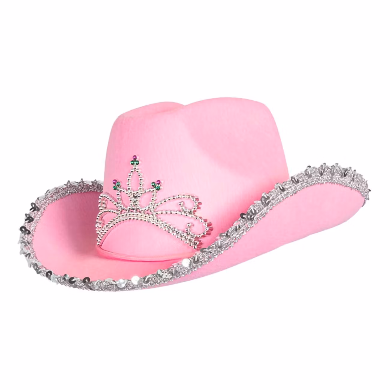 Cowboyhatt Rosa med Tiara för Barn är en rosa cowboyhatt för barn med rosa fluff, dekorerad med skimrande tiara och glitter runtom. Hatten kommer med justerbart snöre.