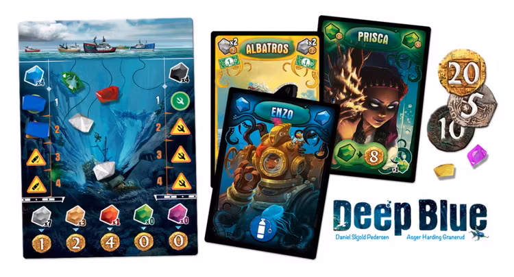 Deep Blue is a press-your-luck and engine-building, family game in which players dive for wealth and may join and benefit from other player's diving fortunes. In this game, players have to collect the right crew of divers, sailors, and archeologists, race to wreck sites to claim the best spots to dive from, and scout the seas to discover new wrecks. Players have to take risks if they want to be the most wealthy diver!