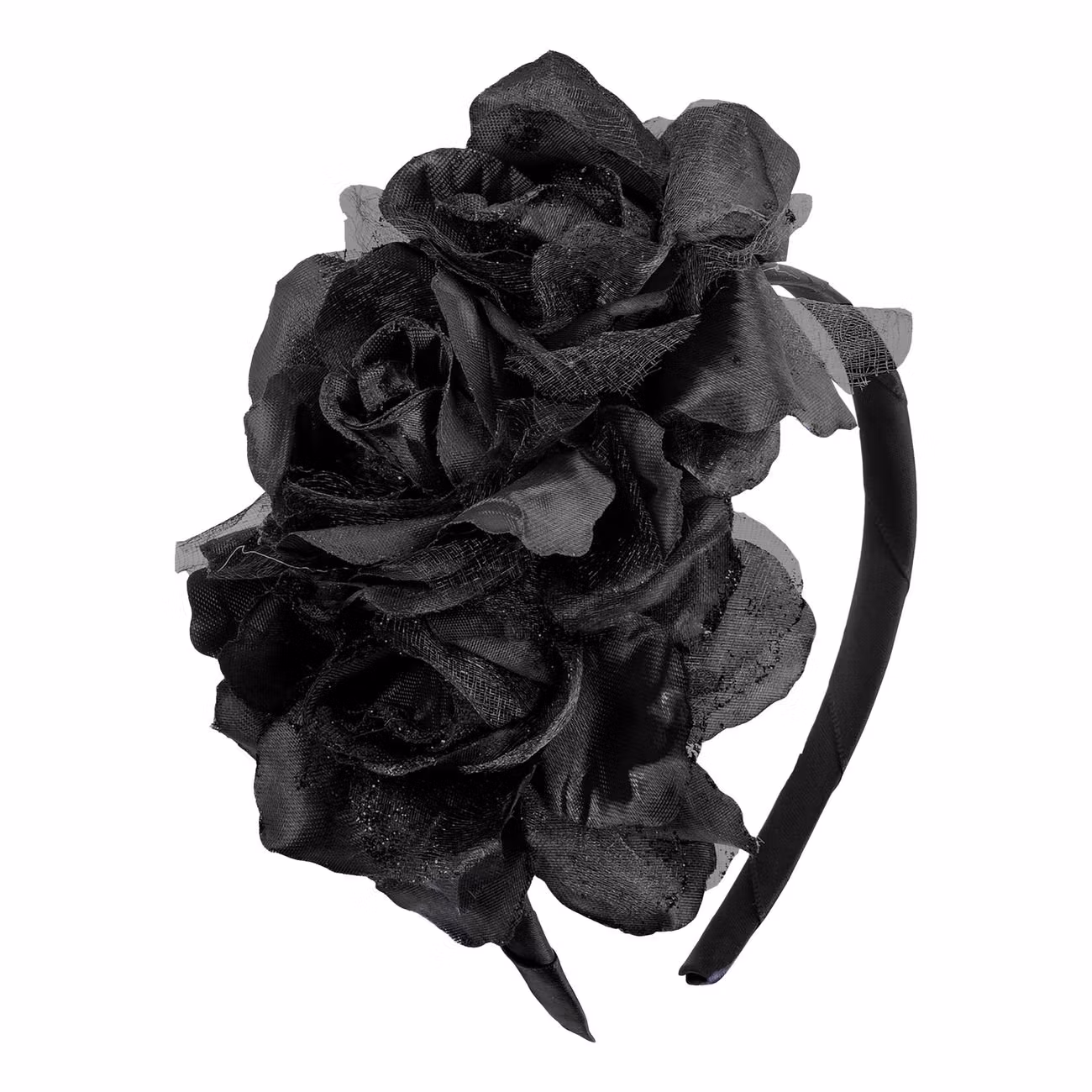 Diadem med Svarta Blommor är ett läckert diadem med med svarta plastblommor, en snygg accessoar att pryda ditt huvud med.