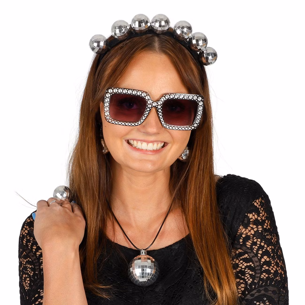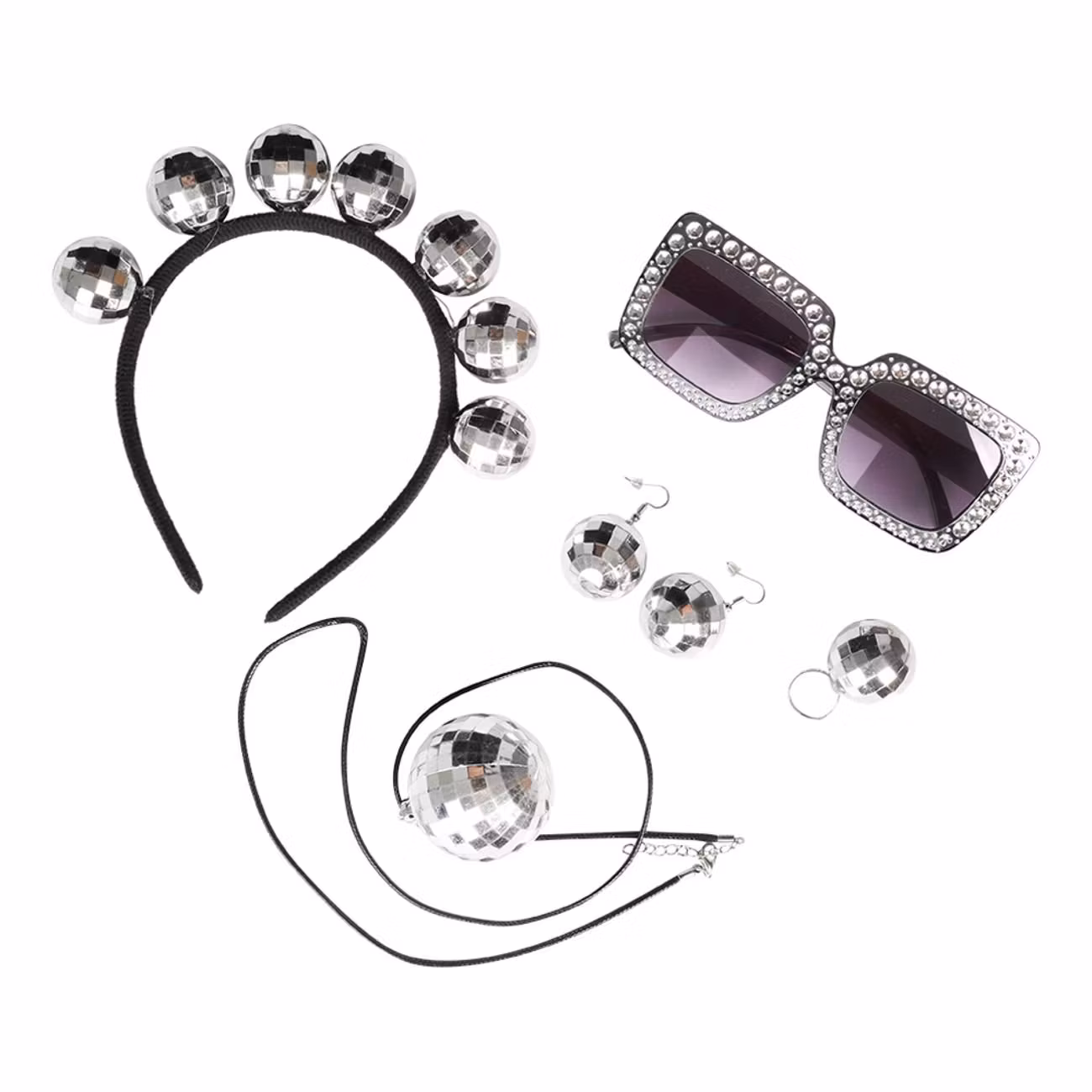 Disco Tillbehörskit är ett komplett kit med glasögon, diadem och smycken som alla kommer toppade med glittrande discokulor. Perfekt till såväl schlagerfest som discofest!