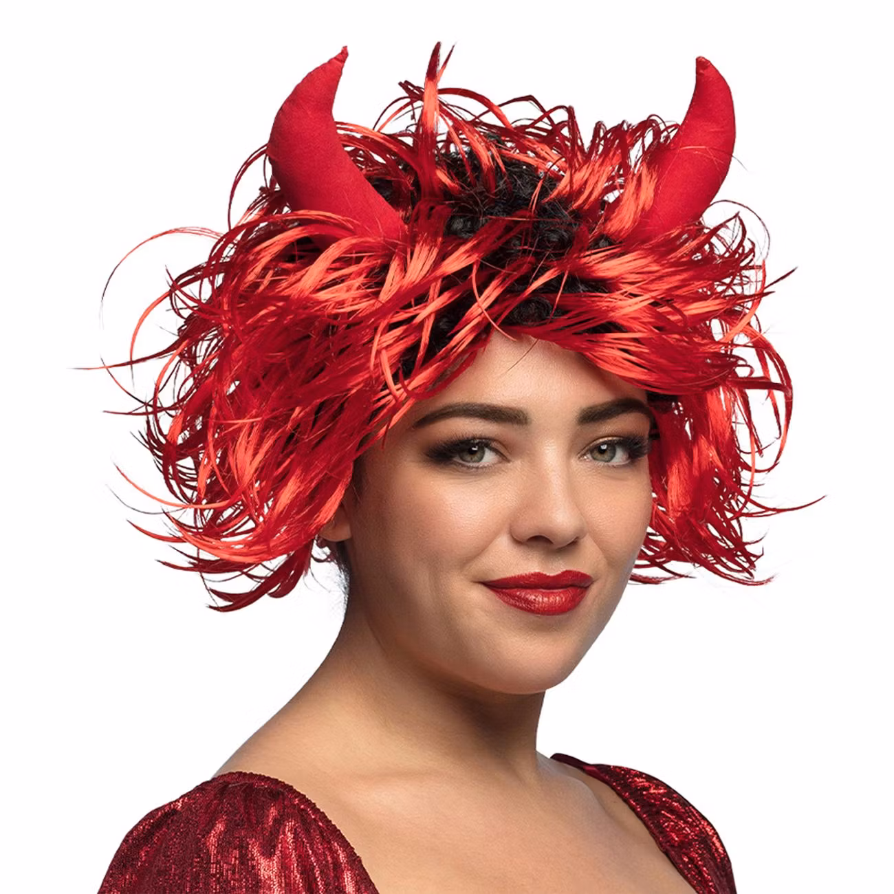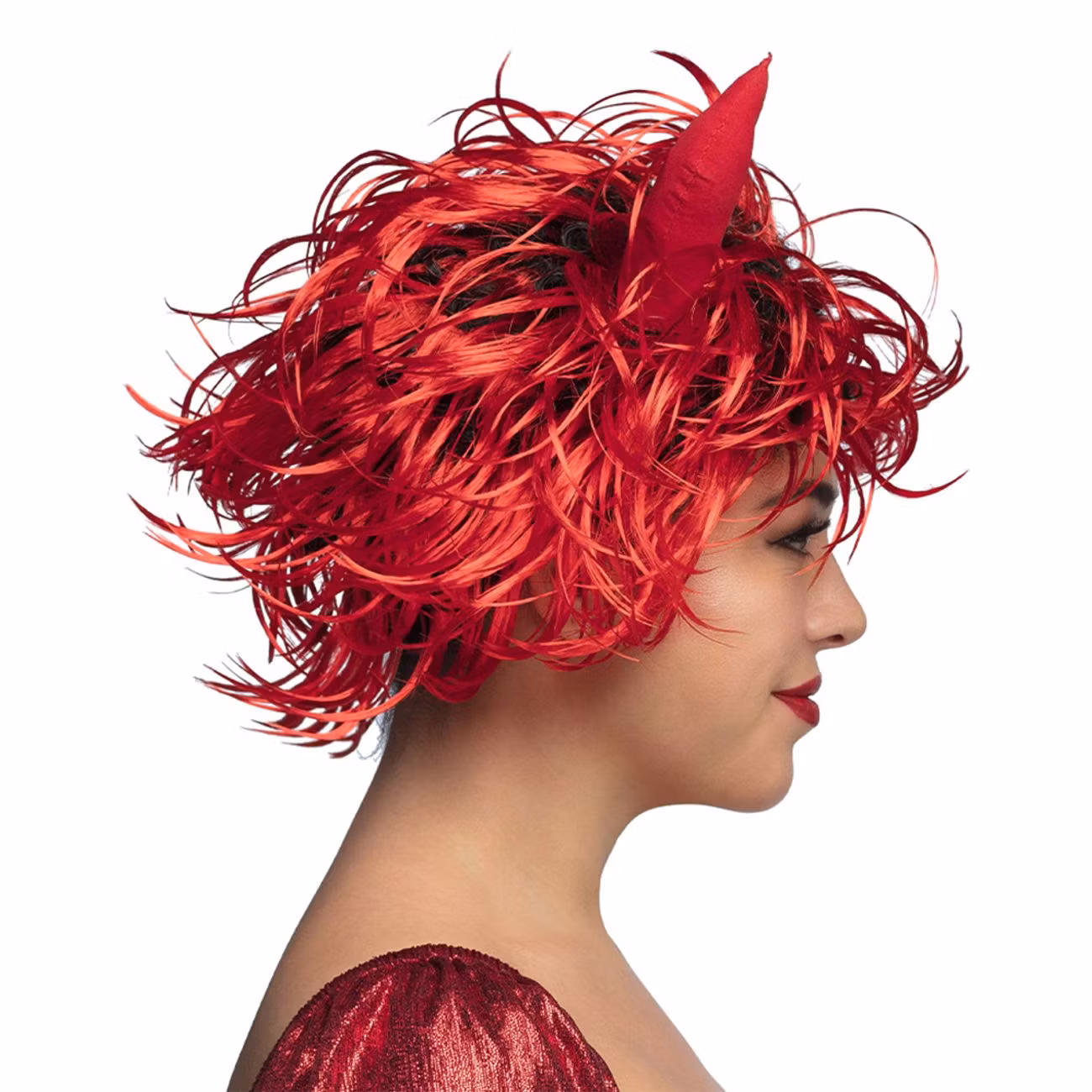 Plocka fram din inre djävul och tillför lite hetta till nästa maskerad. Med eldig frisyr och spetsiga horn i rött blir du redo att skratta ondskefullt och plocka själar till skärselden. Hua!