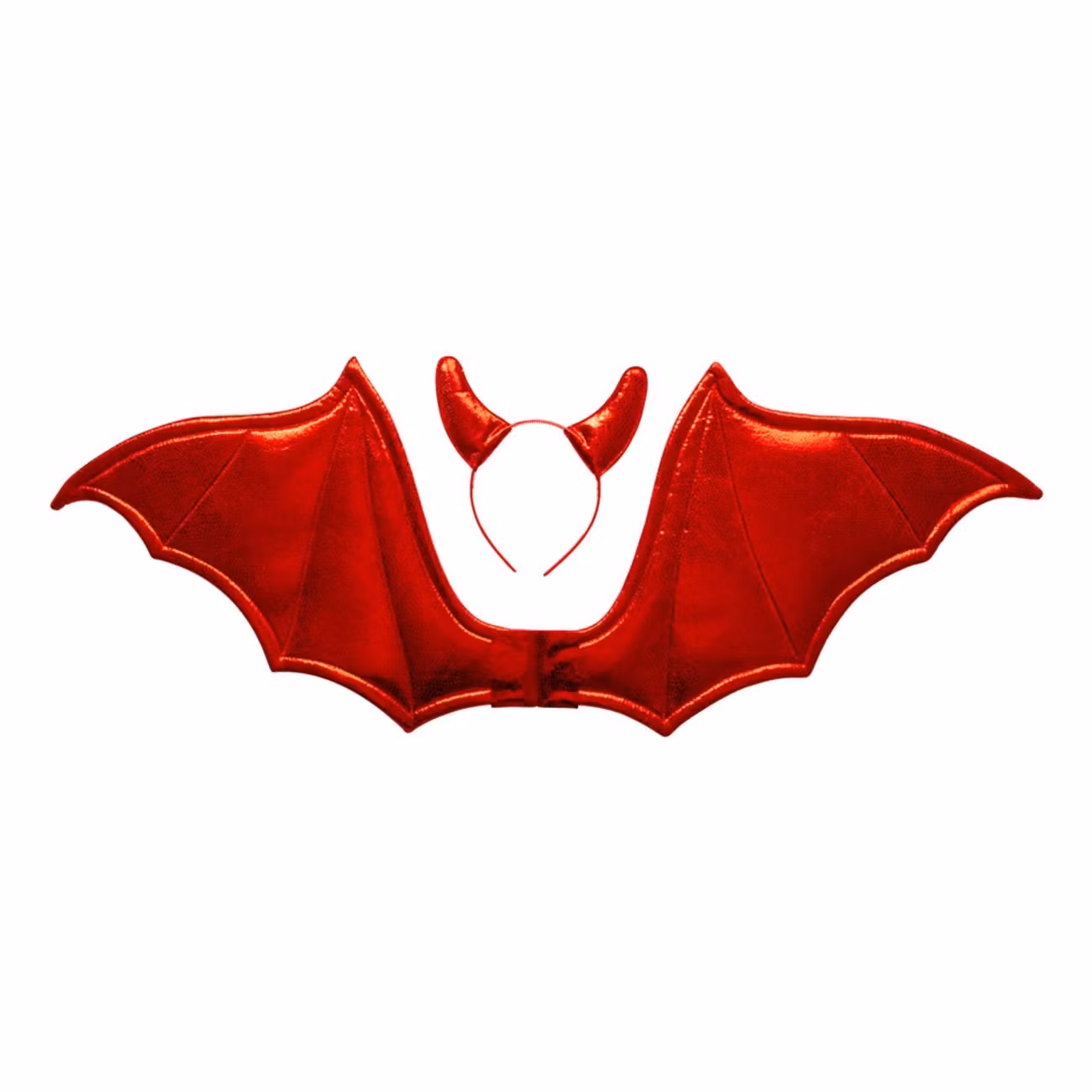 Djävul Vingar & Horn inkluderar ett par mjuka, röda djävulsvingar och ett rött diadem med två röda djävulshorn. Vingarna sitter på plats med axelband. Perfekt djävulsset till Halloween!