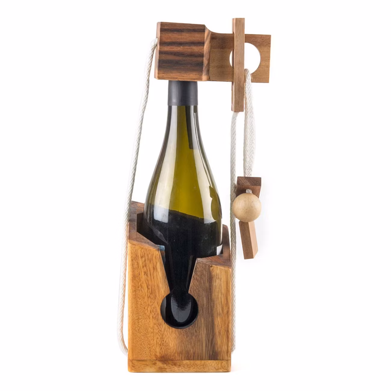 Don't Break The Bottle Vinpussel är ett klurigt pussel där du låser in vinflaskan och måste lösa ut den genom att lösa pusslet. Dra i snöret, vrid kulan genom hålet, lossa den ena träbiten och för den över den andra... Plötsligt har du en vinflaska att belöna dig med! En klockren present att kombinera med en vinflaska!