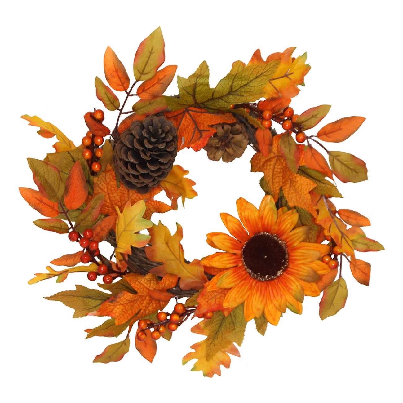 Dörrkrans Höst är en höstig krans som kommer fylld med röda bär, kottar blommor och blad i gula, orangea och gröna färger. Passar utmärkt att hänga upp på en dörr både utomhus och inomhus.