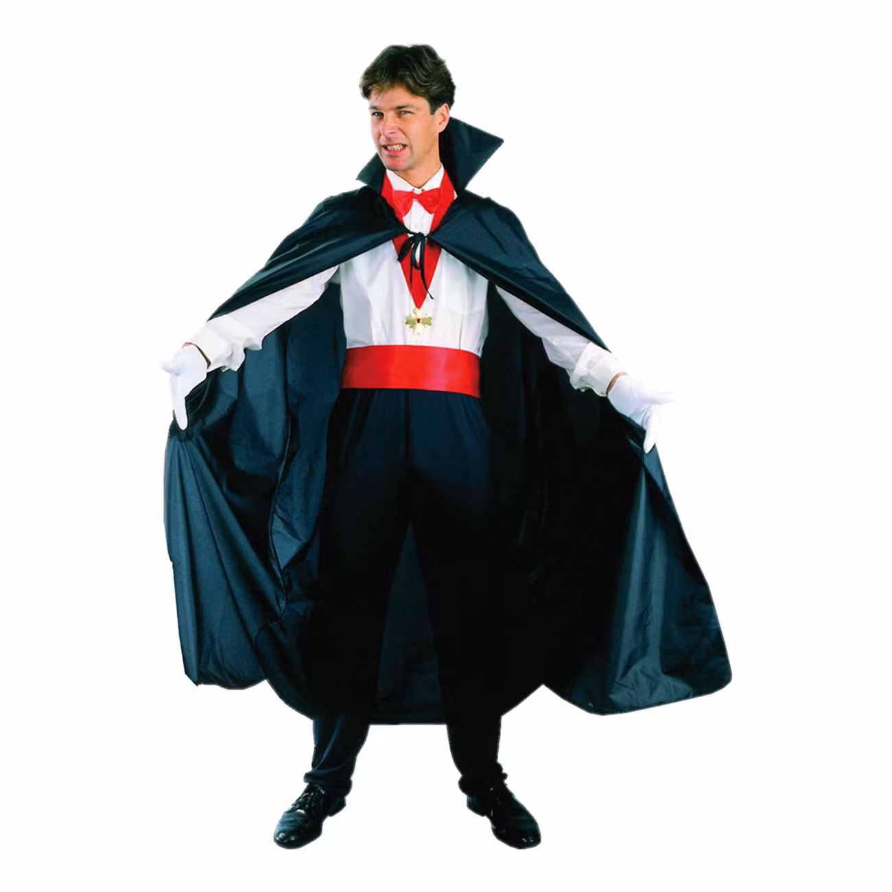 Draculacape är tillverkad av polyester och har ett svart, blankt utförande med en krage och snören framtill som man kan knyta fast cape över axlarna med.