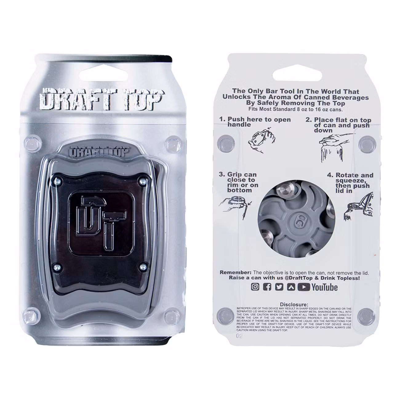 Här har vi den - säsongens häftigaste pryl! Trött på att dricka ur stora burkar med små hål? Kapa toppen då! Med Draft Tops burköppnare är det lättare än någonsin att förvandla sin burk till en häftig mugg med plats för is, citronskiva och sugrör. Mojängen fixar också så att kanterna blir runda och mjuka så det finns ingen risk att skära läpparna. Funkar på burkar i alla storlekar!