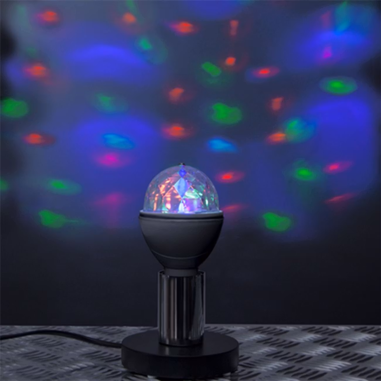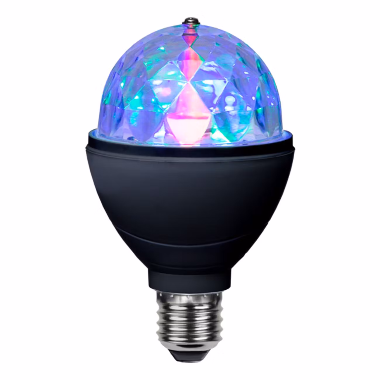 Med den här smidiga lampan i jackfickan har du alltid med dig festen - vart du än går! Hemma hos en kompis utan festbelysning? Inga problem! Hitta närmsta E27-sockel och skruva i den här röd-grön-blå-snurrande discolampan för maximal partyeffekt!