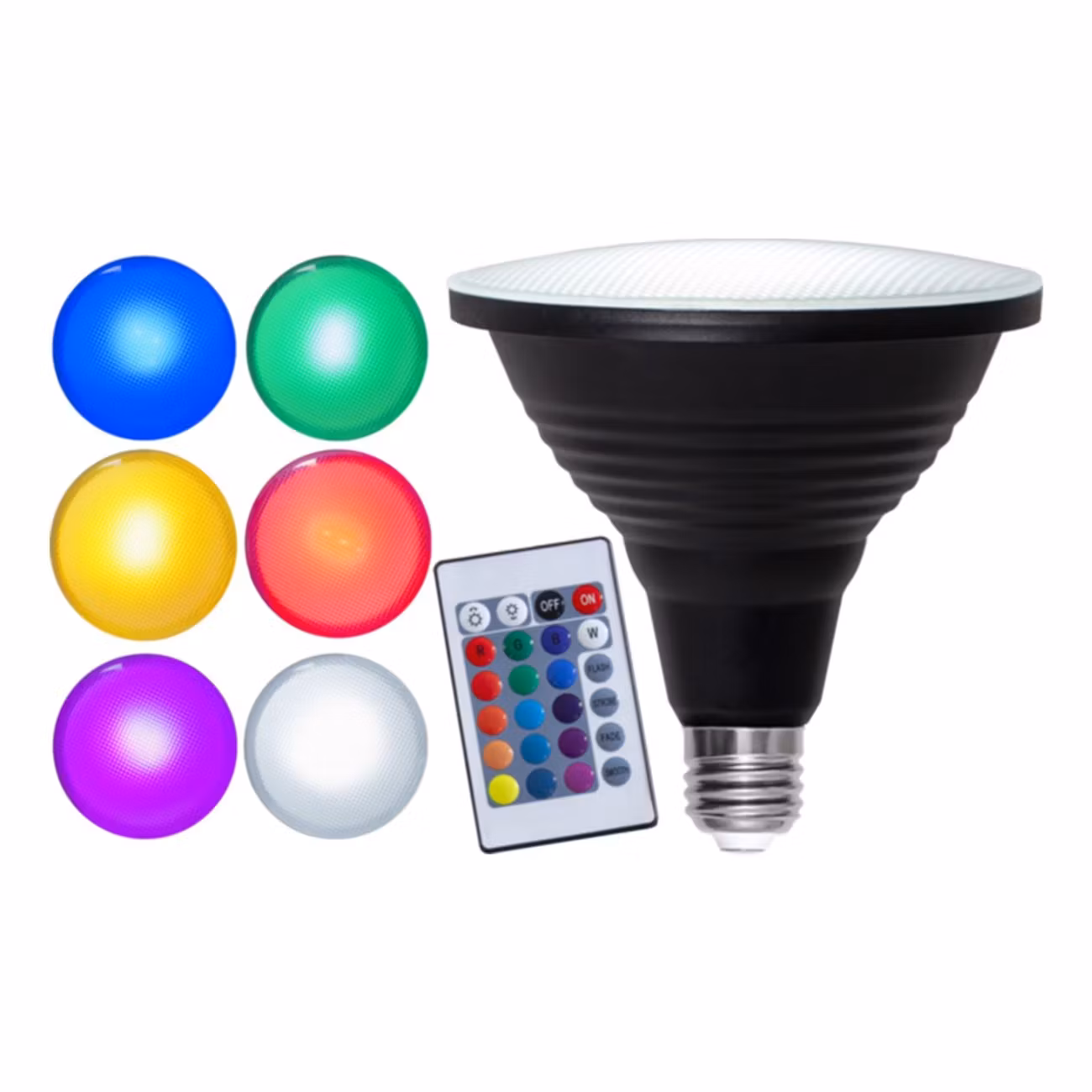 E27 Utomhuslampa med Fjärrkontroll är en spotlight med RGB-kontroll för utomhusbruk, för att skapa effektfullt ljus i trädgården. Lampan mäter 13 x 12 cm och passar i E27-socklar. Säljs styckvis.