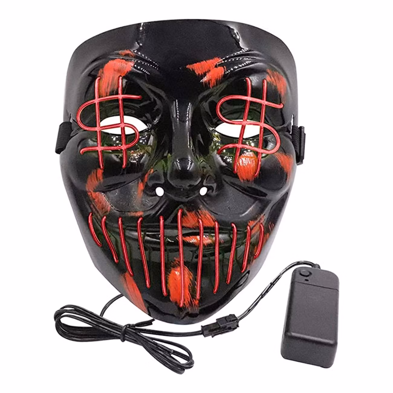 El Wire Dollarsign LED Mask lyser och har ett motiv bestående av en LED-slinga formad som dollartecken för ögonen och stygn för munnen. Masken kommer med tre olika inställningar för LED-slingan: konstant, långsamt blinkande och snabbt blinkande. Masken täcker ansiktet och har hål för ögon och mun. Den sätts enkelt på med elastiskt band runt huvudet. Säljs i olika färger på LED-belysningen, samtliga masker är svarta med röda fläckar. Kommer i one size för vuxna. Drivs av 2 x AA-batterier, vilka ej medföljer men finns att köpa till.