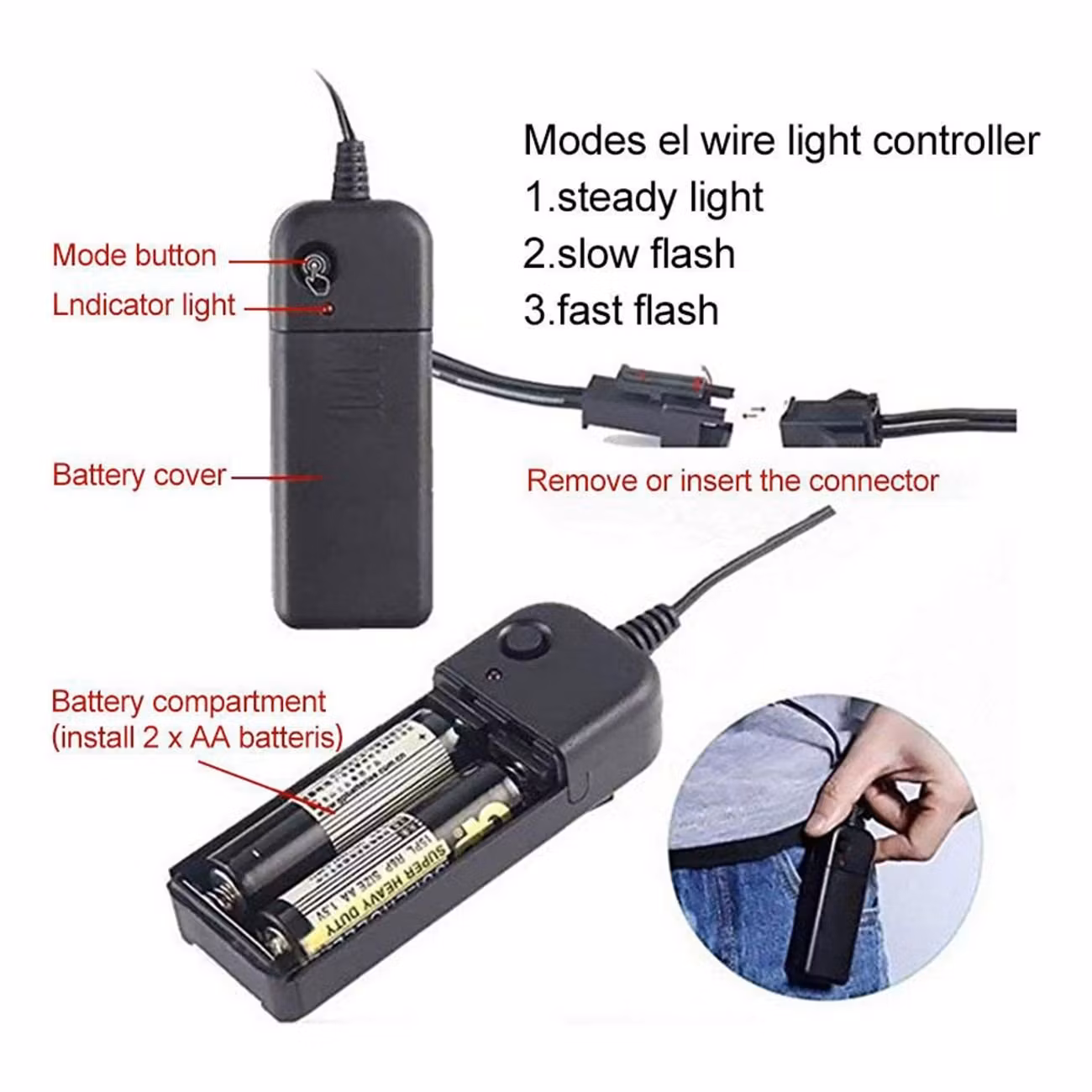 - Välj mellan tre lägen: konstant på, snabbt blinkande och långsamt blinkande.