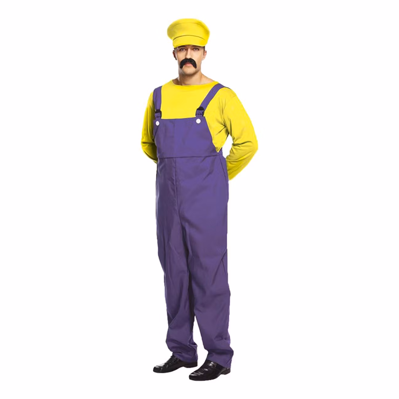 Elak Rörmokare Gul Maskeraddräkt inkluderar en tröja, ett par hängselbyxor och en hatt. Tröjan är gul med långa ärmar. Den är tillverkad av ett lätt glansigt, stretchigt material. Byxorna är lila med 2st knappar framtill och hängslen som regleras med hjälp av svarta spännen. De är långa och raka i modellen. Hatten är tillverkad av tygklädd skumgummi. Den går i samma gula nyans som tröjan, står upp något på huvudet och har en mjuk skärm framtill. Fylls med fördel med t. ex. papper vid behov. Mustaschen och skorna på bilden ingår ej.