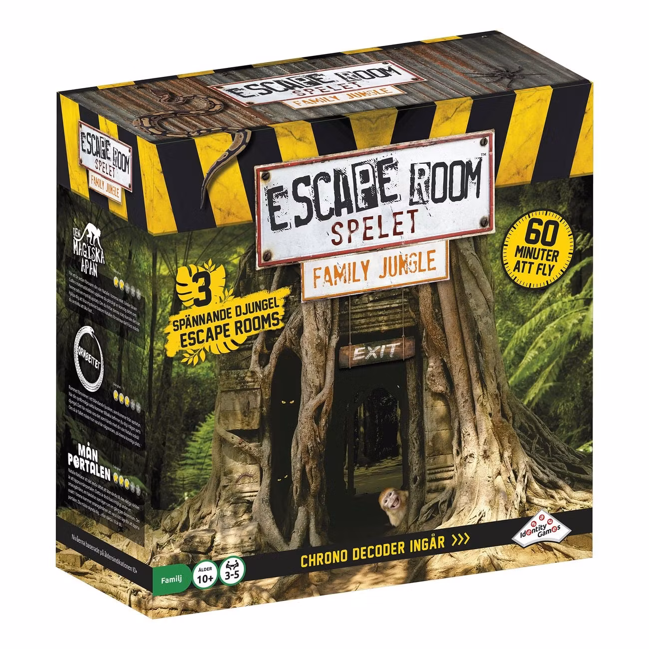 Escape Room Family Jungle består av tre olika äventyr och spelas med hjälp av Chrono Decoder och nycklar. Målet är att samarbeta för att lösa pussel och dekryptera koder inom 60 minuter. Spelet innehåller ledtrådskort för extra hjälp och en timer håller spänningen på topp.