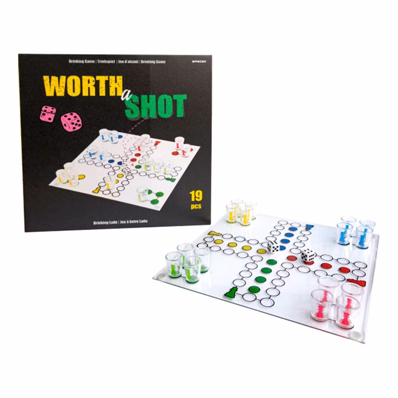 - Inkl. 1x spelplan, 16x shotglas (á 8 ml) och 2x tärningar