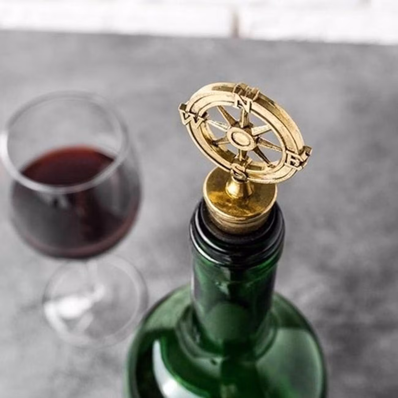 Flaskstopp Kompass innehåller en kork i metall som är utformad som en kompass som passar vinflaskor. Produkten mäter 3,6 x 10,3 x 2,1 cm och säljs styckvis.