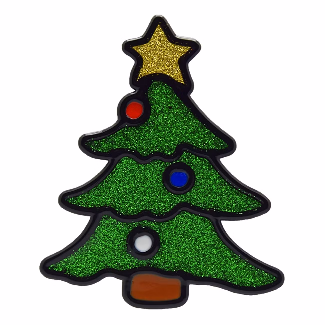 Fönsterdekor Julgran är en självhäftande grön julgran med färgglada julkulor och en stjärna i toppen. Fönsterdekoren är tillverkad i plast och den är ca 13,5 cm stor.