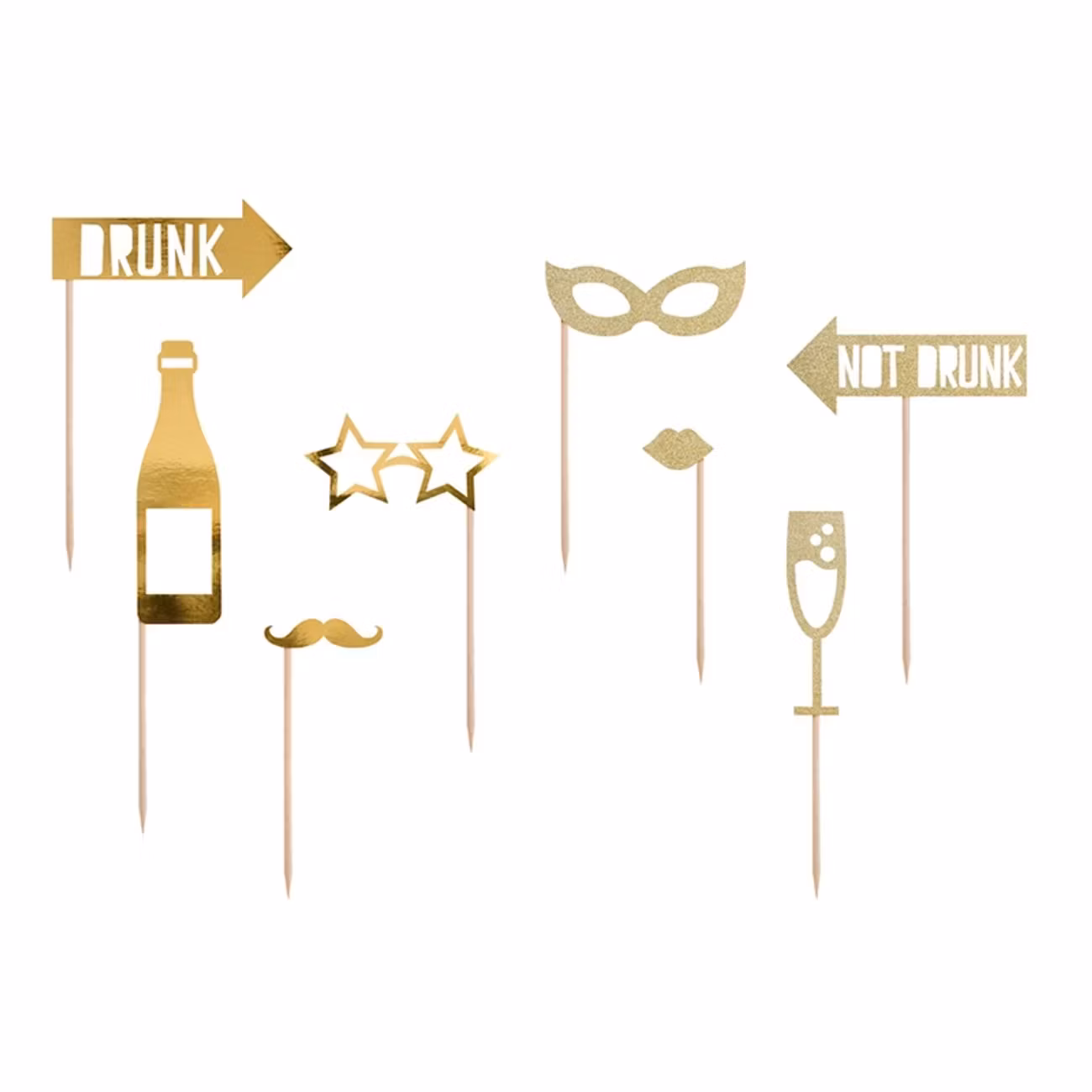 Foto Props Nyårsafton Guld inkluderar åtta stycken guldfärgade fotoprops med olika motiv, till exempel en champagneflaska, en mustasch och ett par glasögon. De är tillverkade i papp och trä och har olika storlekar. De minsta är 21 cm och de största 42 cm. Fotopropsen monteras ihop efter leverans.