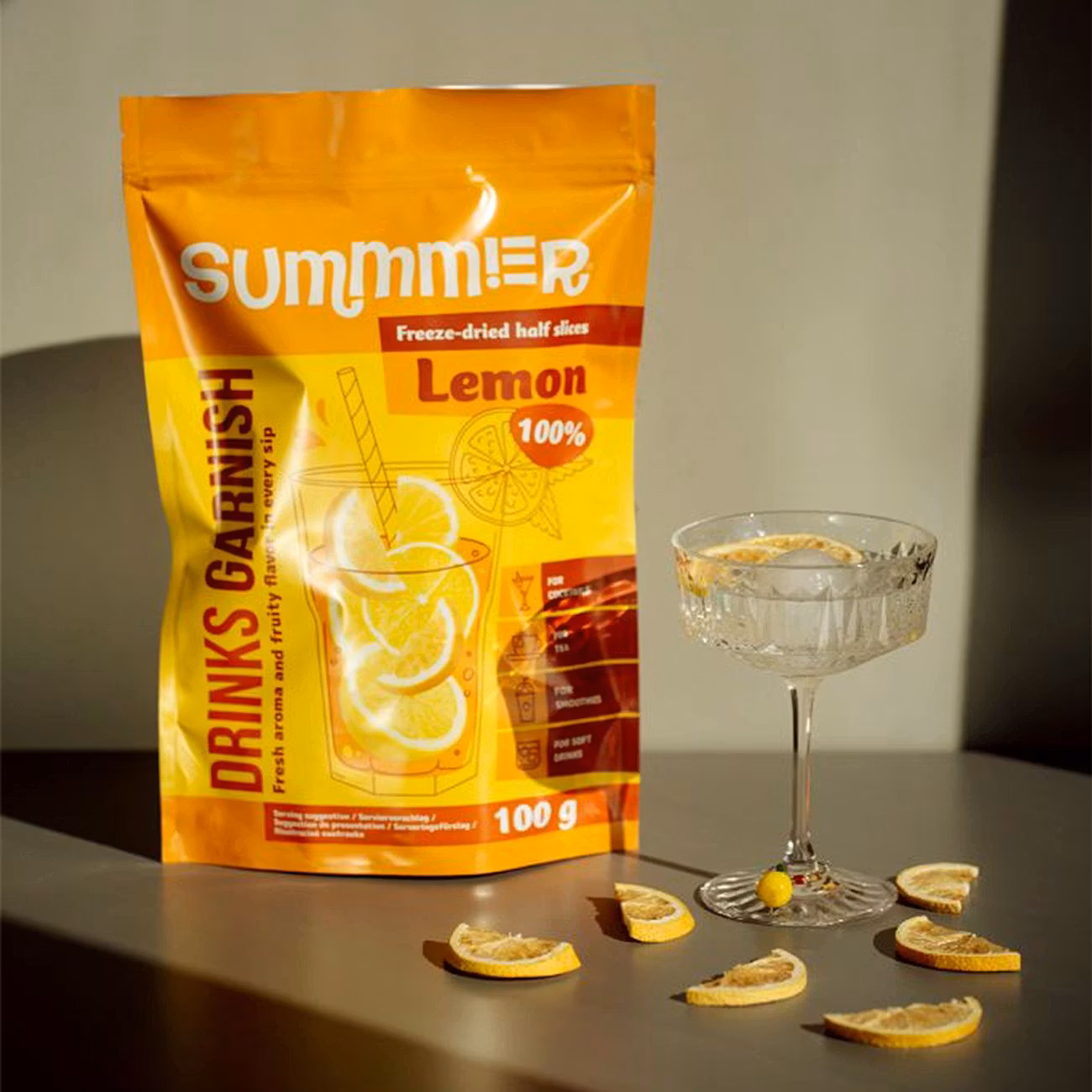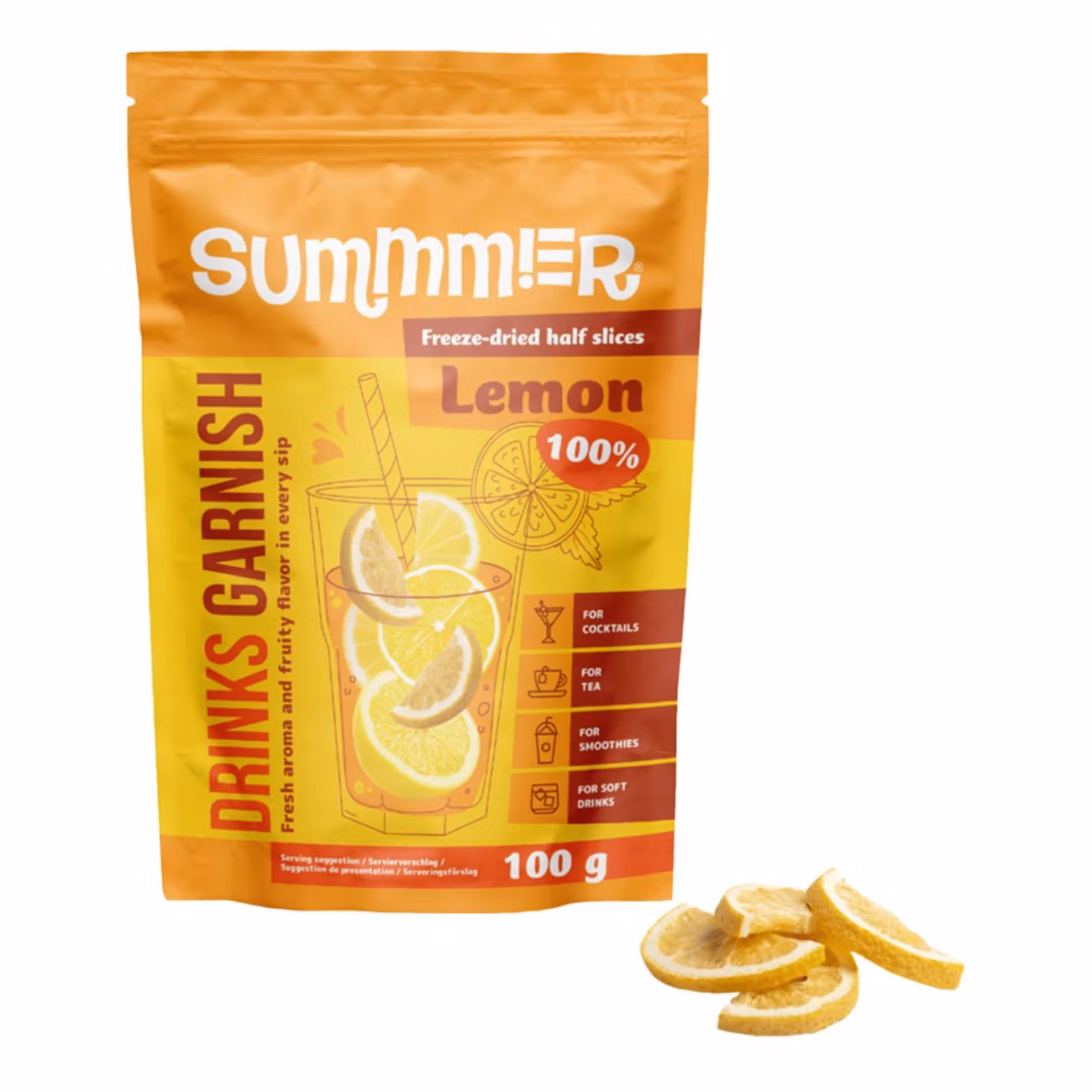Ge drinken det där lilla extra med några frystorkade citronskivor. En lätt syrlig smak som dessutom gör drinken mycket snyggare. Perfekt för sommarbjudningen!