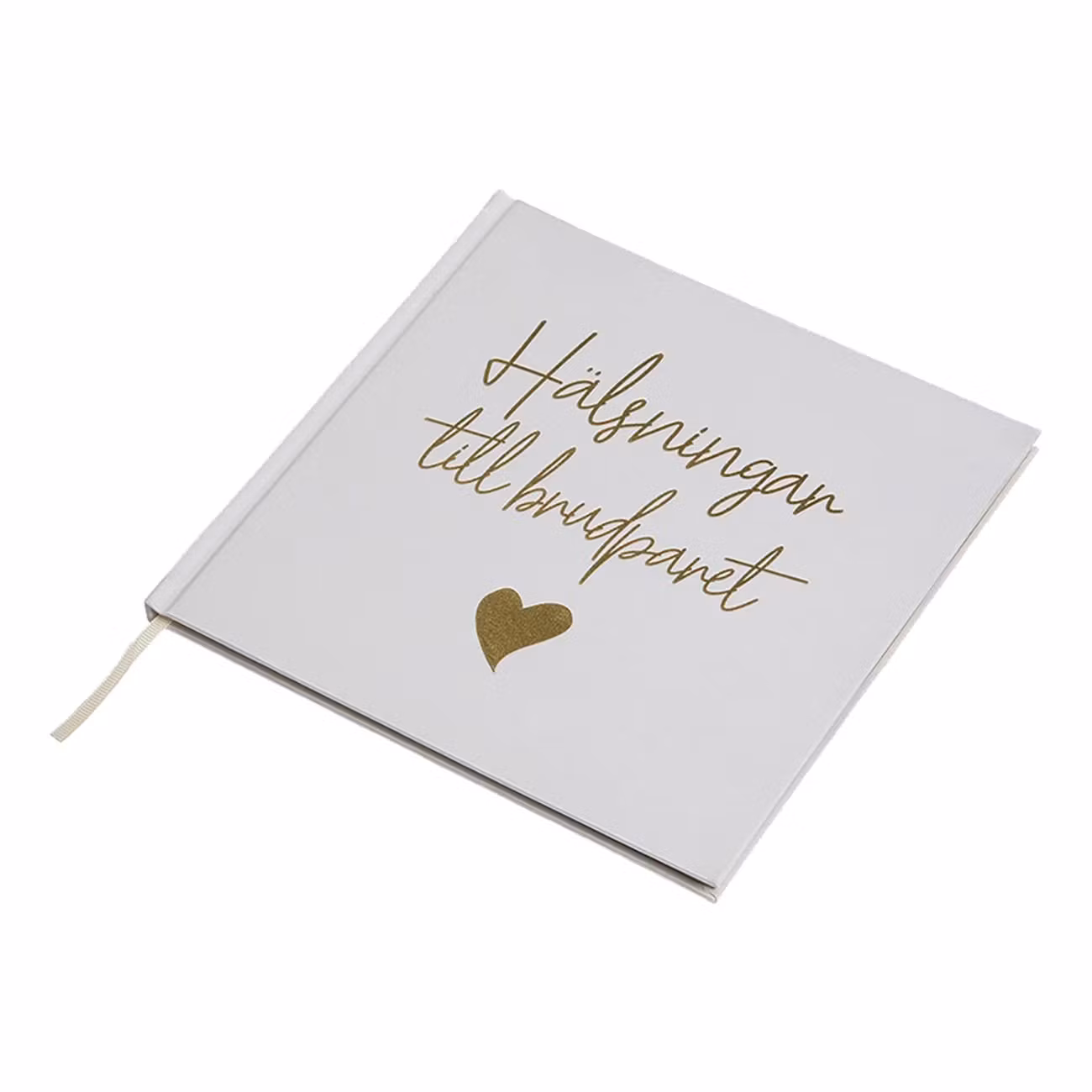 Gästbok Hälsningar Till Brudparet är en vit gästbok av pappmaterial med ett 30-tal blanka sidor i. På boken står det "Hälsningar till brudparet! med guldbokstäver.
