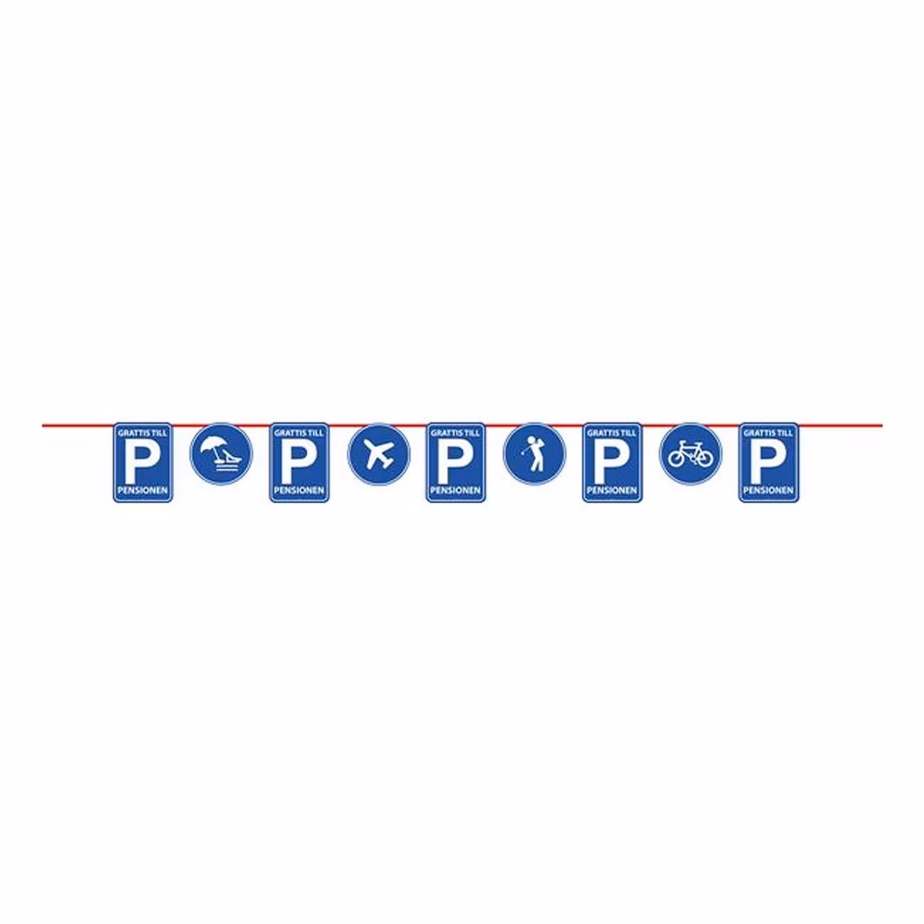 Girlang Grattis Till Pensionen kommer med blåa skyltar med texten "Grattis Till Pensionen" tillsammans med inspirerande motiv som nu den nyblivne pensionären kan hitta på. Resa, spela golf, cykla och resa vart som helst i världen!