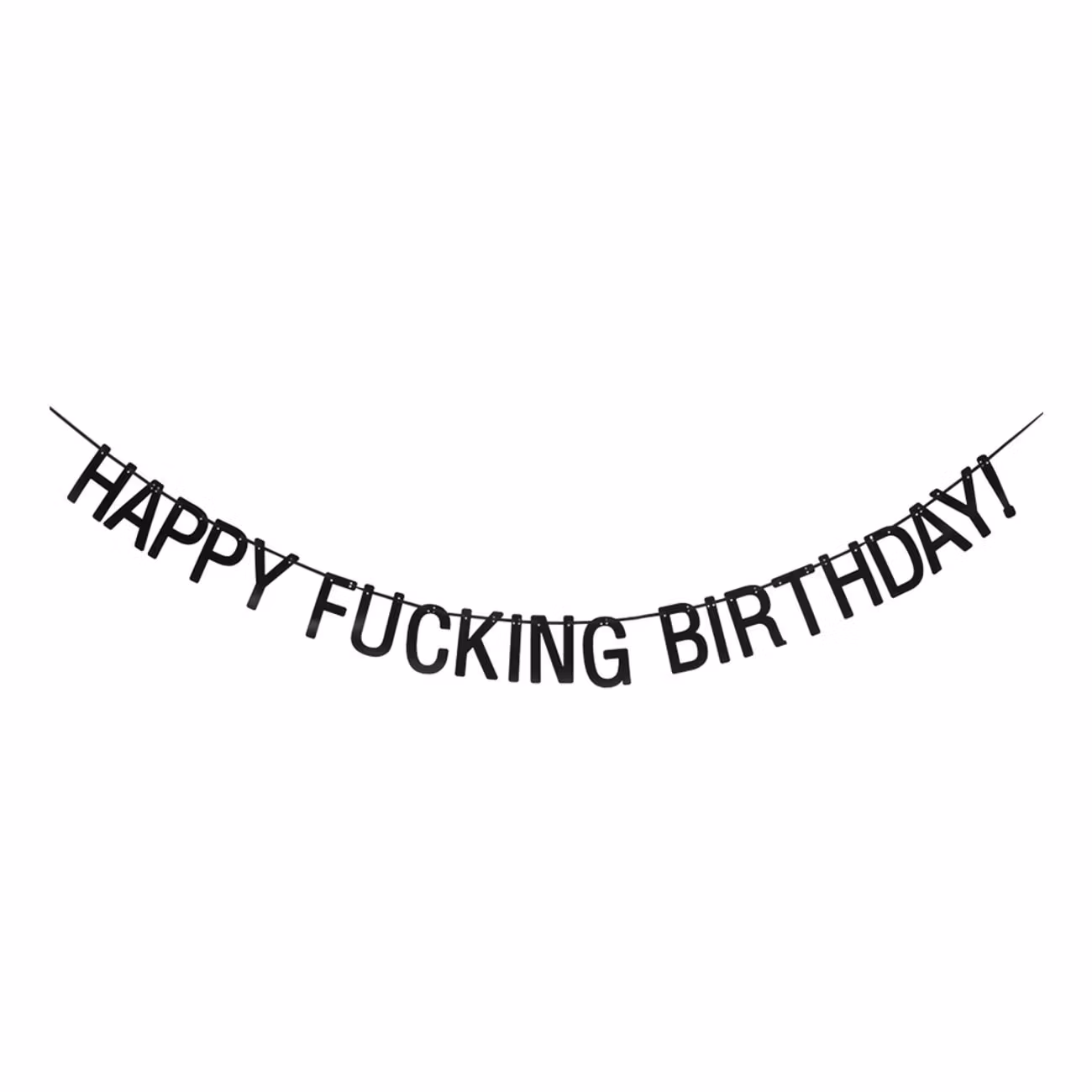 Girlang Happy Fucking Birthday innehåller en girlang i FSC-papper. Girlangen är svart med bokstäver som bildar orden "Happy Fucking Birthday". Den är 20 x 360 cm stor. Girlangen är enkel att hänga upp mellan två krokar eller med lite tejp. Den kan användas flera gånger.