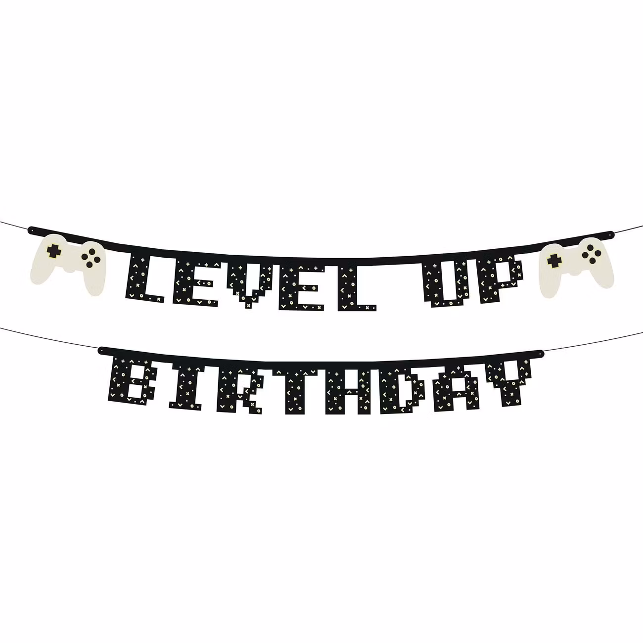 Girlang Level Up Birthday är en festlig dekoration gjord av papper. Den stavar ut "LEVEL UP BIRTHDAY" i pixelstil och har små mönster av symboler. Girlangen inkluderar även urklippta delar som föreställer handkontroller vid varje ände. Den hängs upp med hjälp av ett medföljande snöre för enkel montering på väggen.