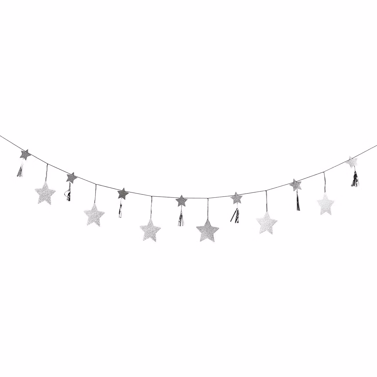 Festlig girlang med motiv av silvriga stjärnor och tassles, kan det bli mer nyår än det? Smacka upp den här i taket och låt den dingla över er samtidigt som ni firar in det nya året!